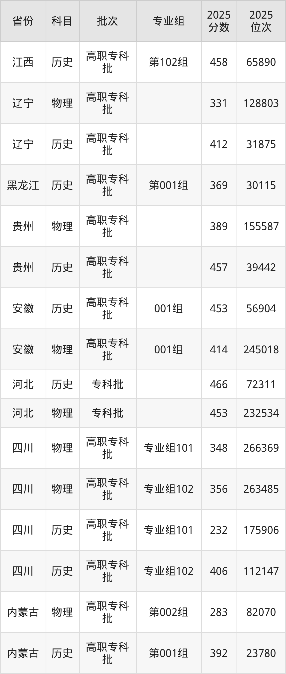 2025年在专科物理类进行招生,各专业组分数线详情如下: