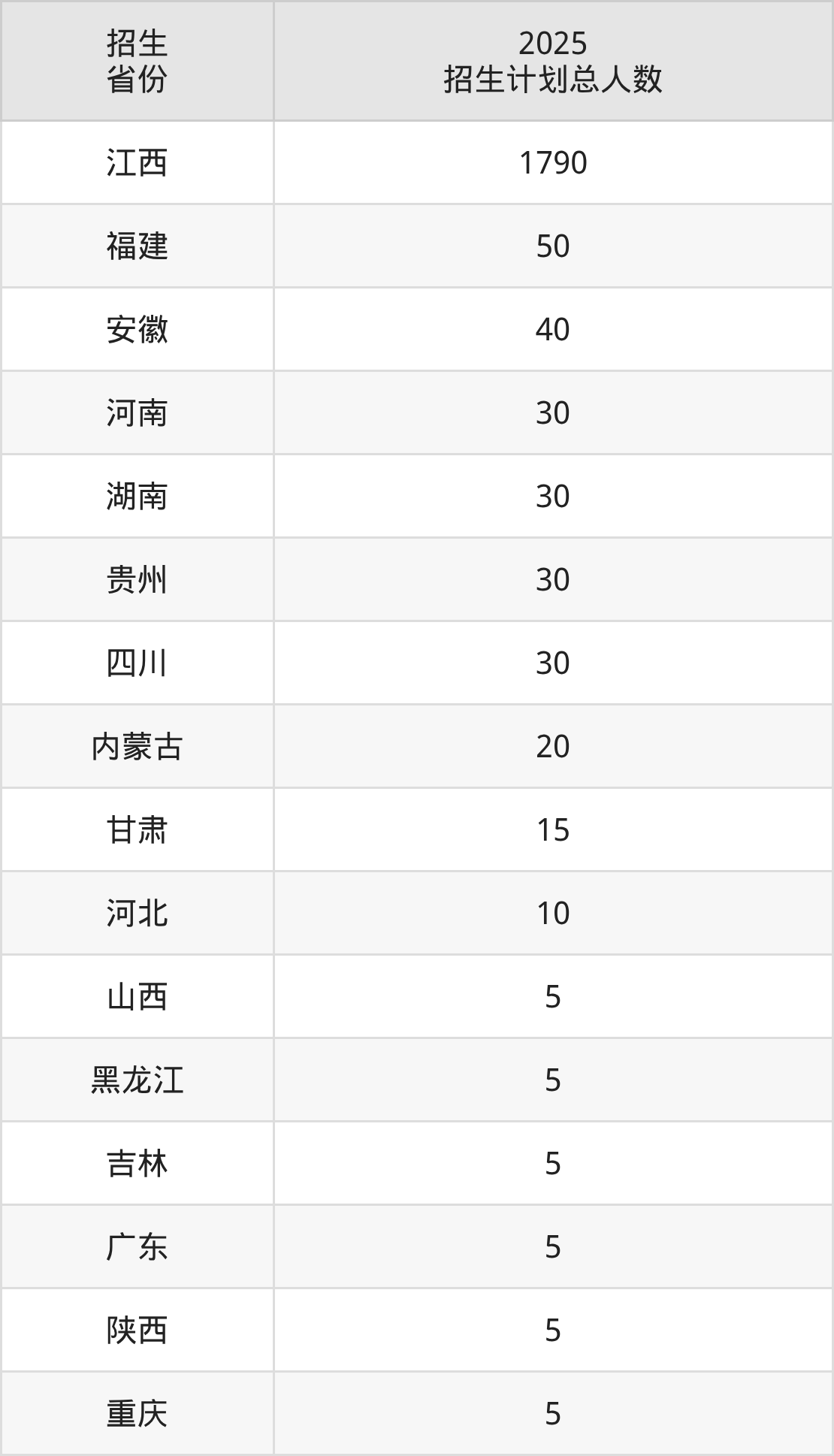 2025年江西师范高等专科学校面向全国18个省市开展专科招生;招生专业共24个,招生人数共2085人。2025年在江西省招生计划总人数是1790人,其中,江西师范高等专科学校在江西省招生人数最多的是机电一体化技术。江西师范高等专科学校在各省具体招生人数情况如下表。