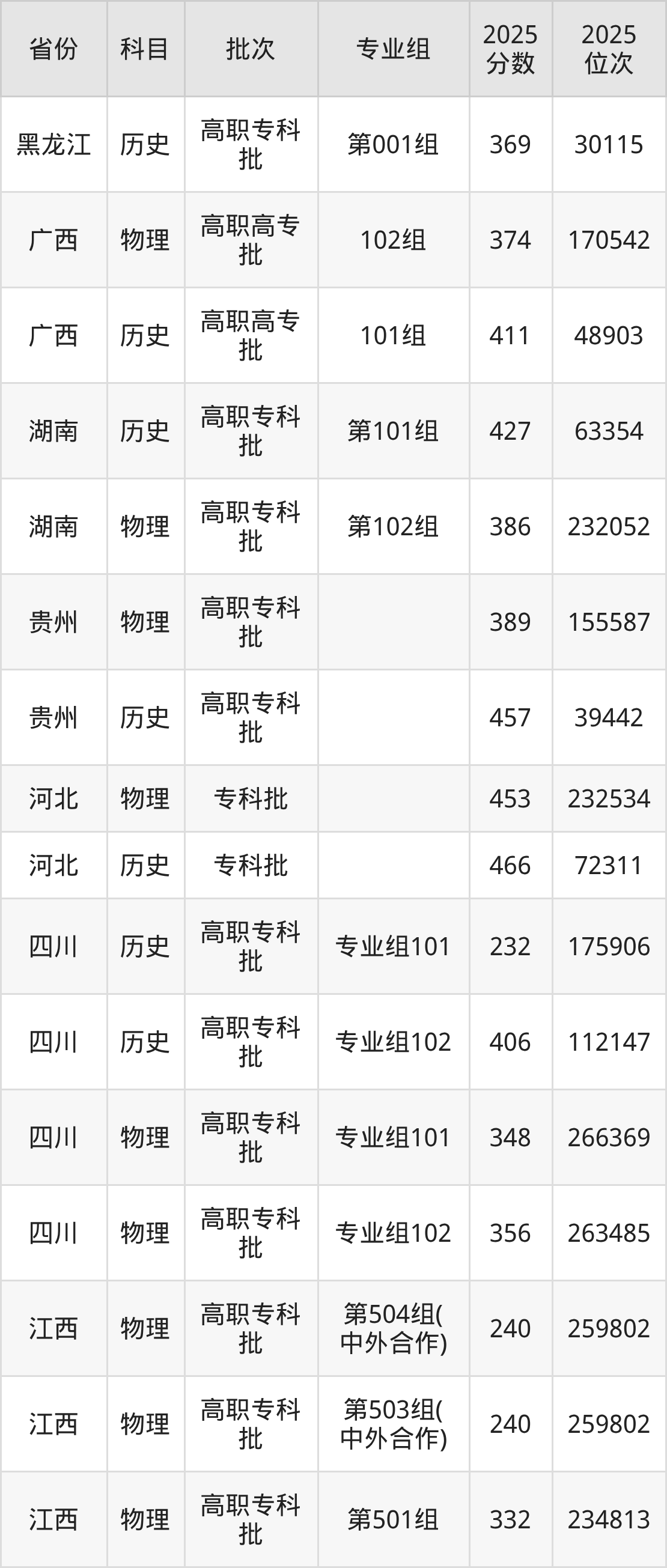 2025年江西师范高等专科学校全国录取分数线是232分到466分,录取最低在四川历史类(专业组101)、录取最高在河北历史类。各省各专业组最低分具有差异,详情如下: