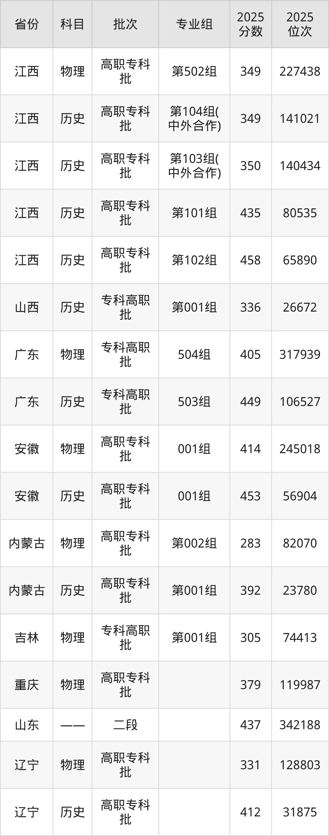 江西师范高等专科学校专业组101:2025年投档录取最低分为348分,录取最低位次为266369名。