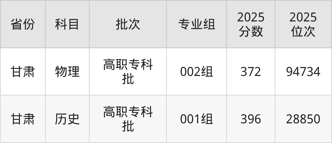 2025年在专科历史类进行招生,各专业组分数线详情如下: