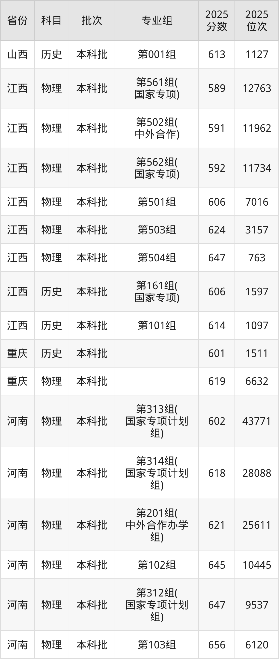 中南大学第002组(国家专项计划):2025年投档录取最低分为600分,录取最低位次为1918名。