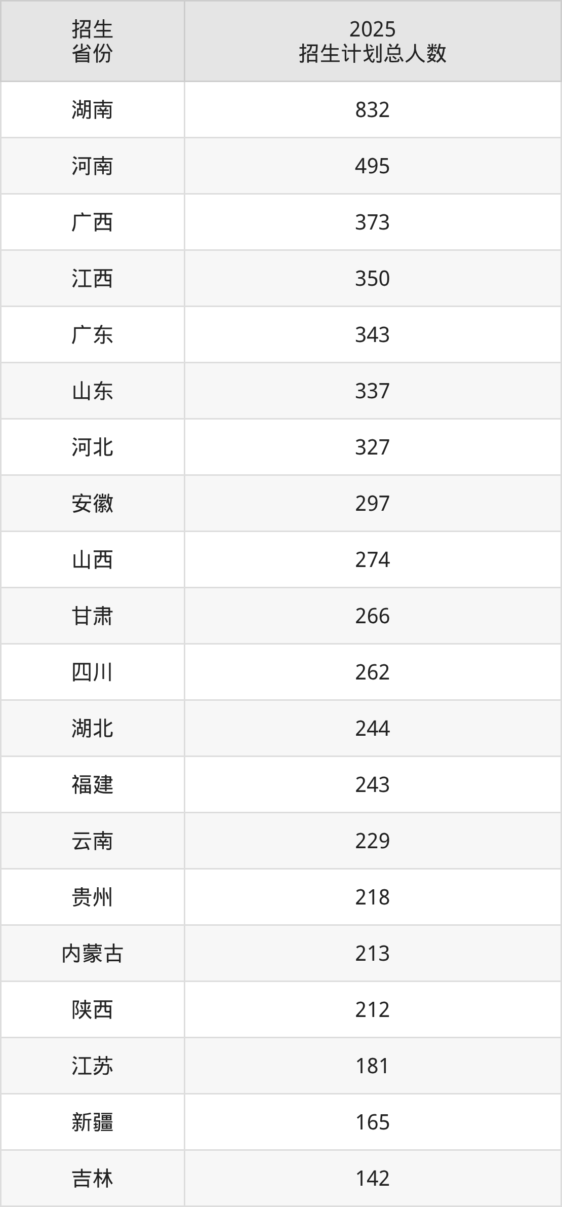2025年中南大学面向全国29个省市开展本科招生;招生专业共59个,招生人数共6832人。2025年在湖南省招生计划总人数是832人,其中,中南大学在湖南省招生人数最多的是临床医学类。中南大学在各省具体招生人数情况如下表。