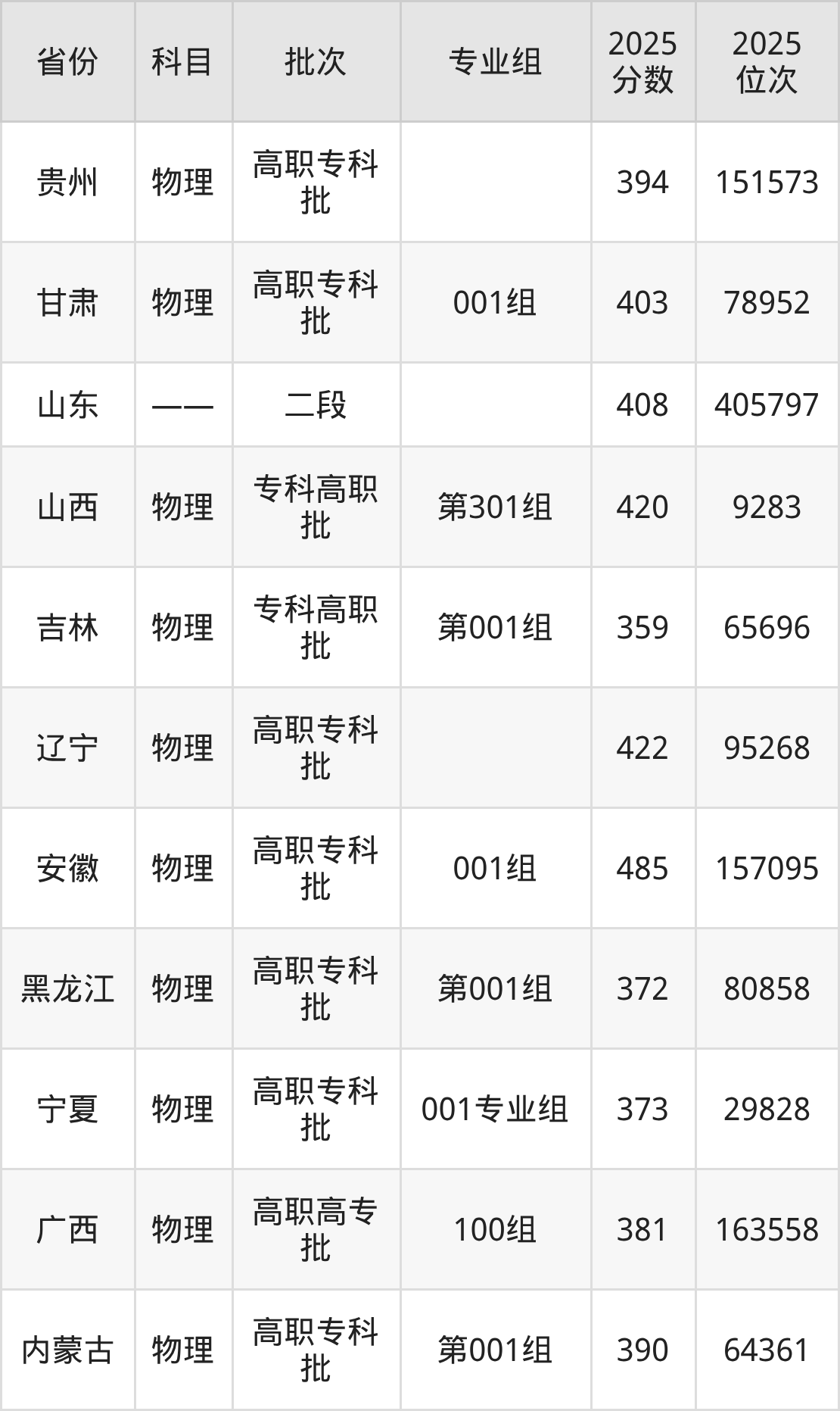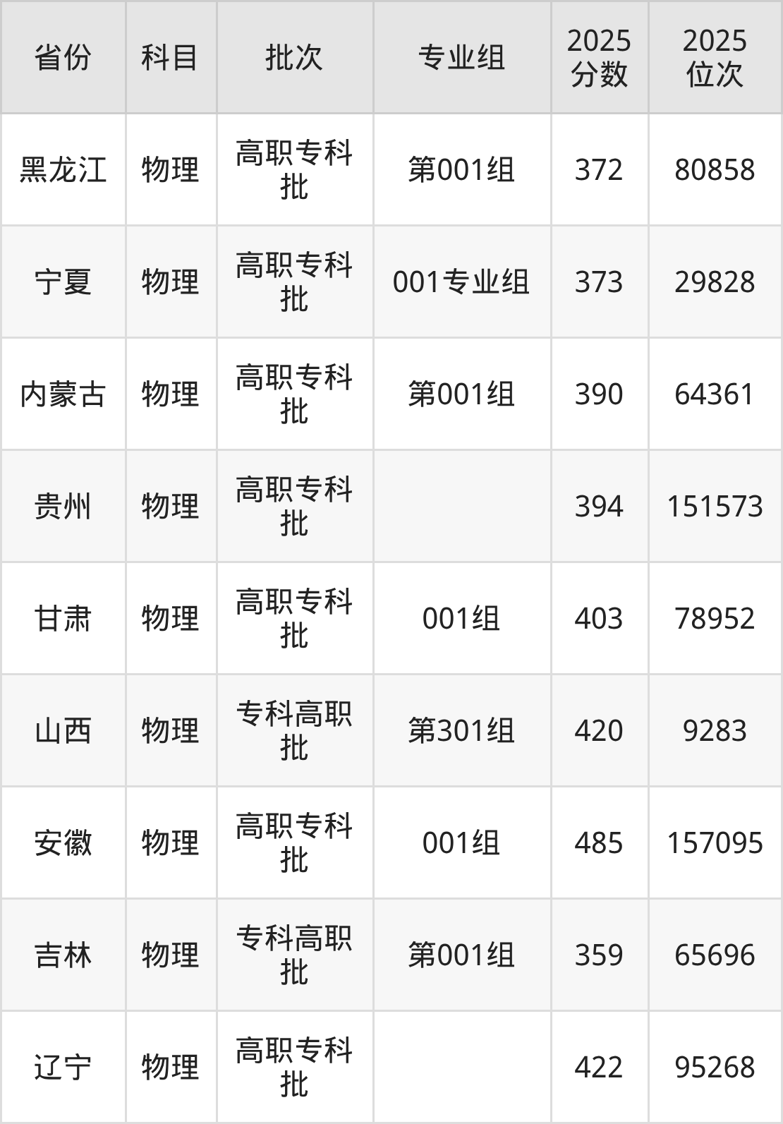 2025年在专科物理类进行招生,各专业组分数线详情如下: