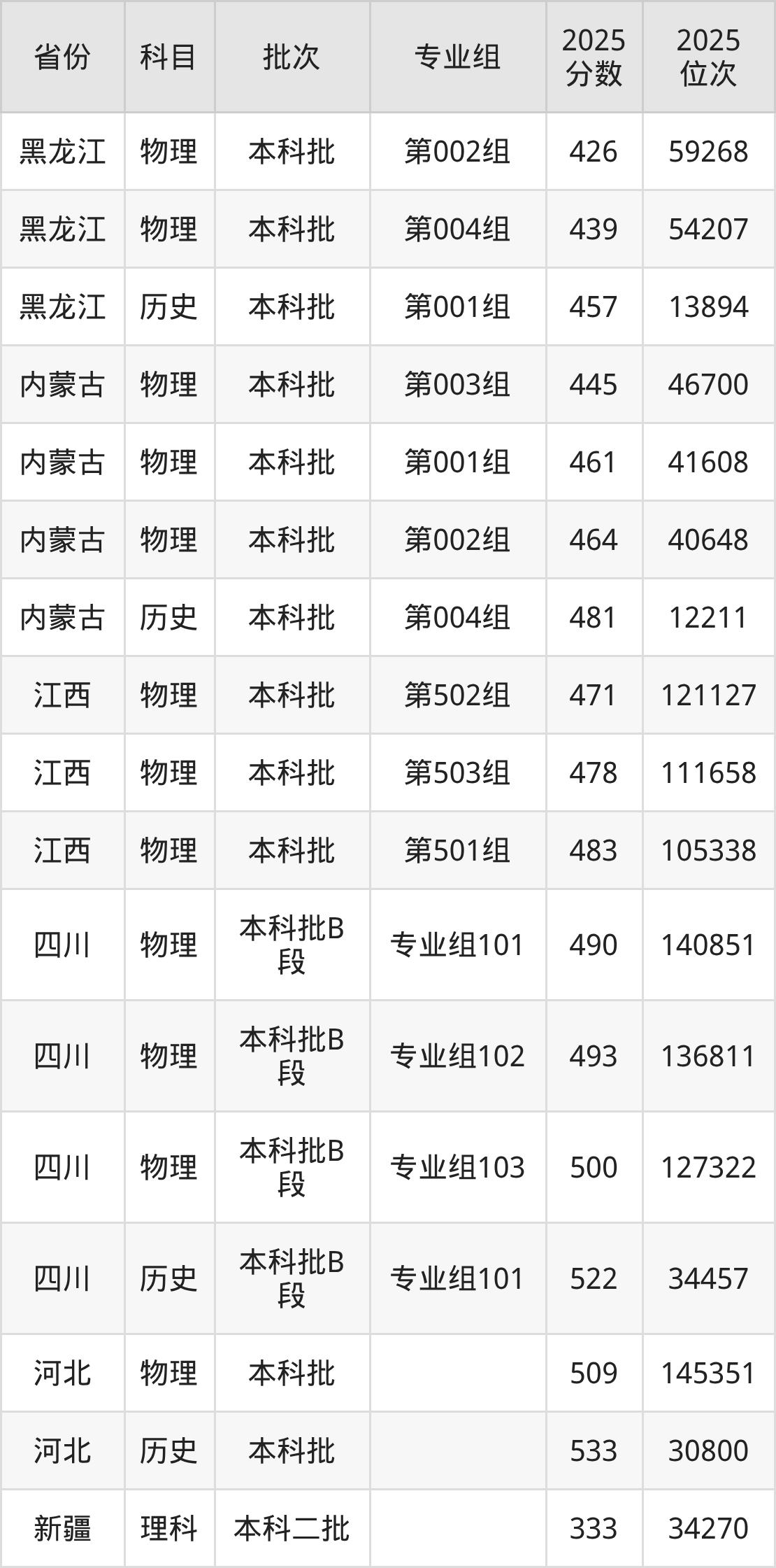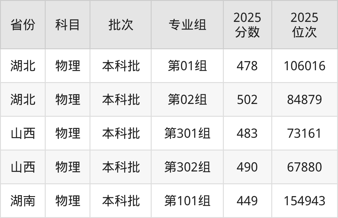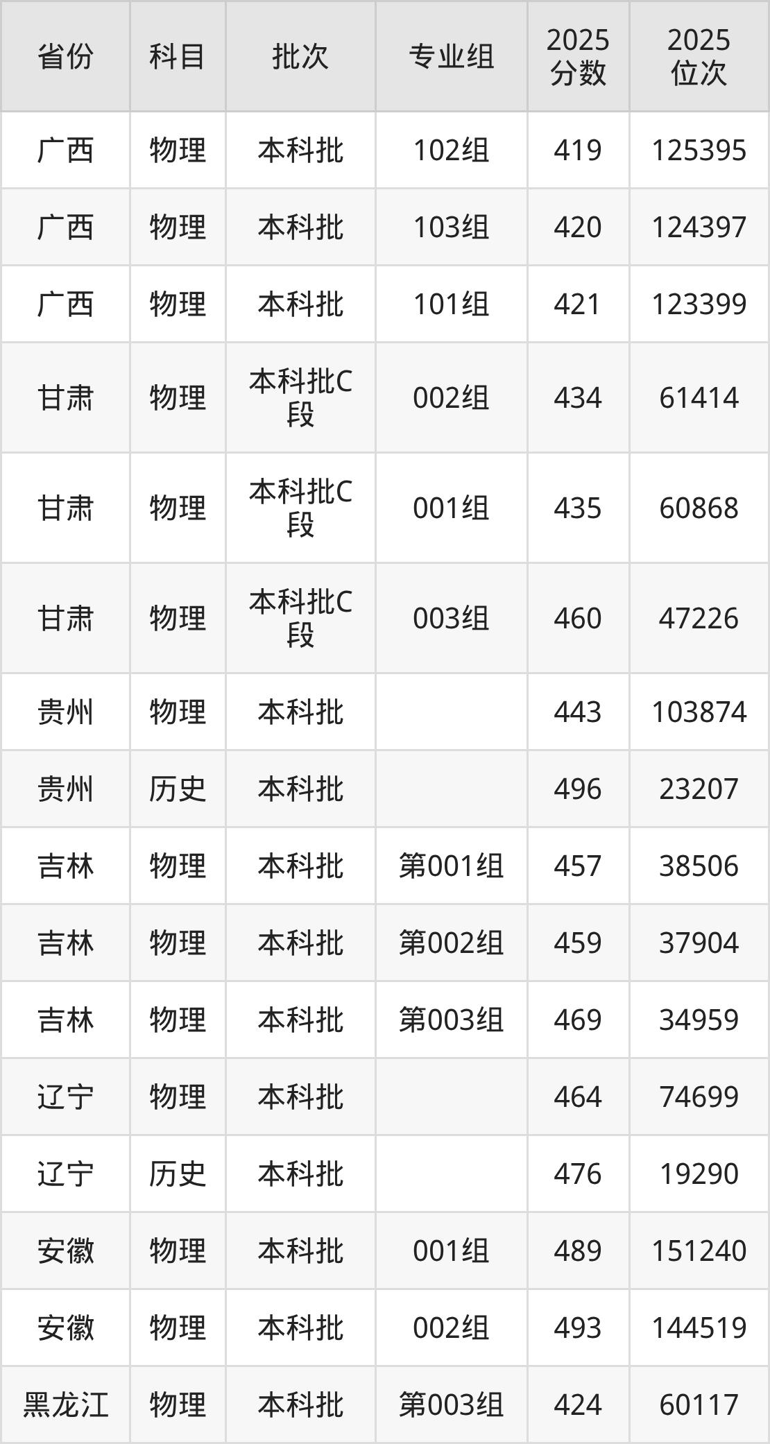 2025年在本科物理类进行招生,各专业组分数线详情如下: