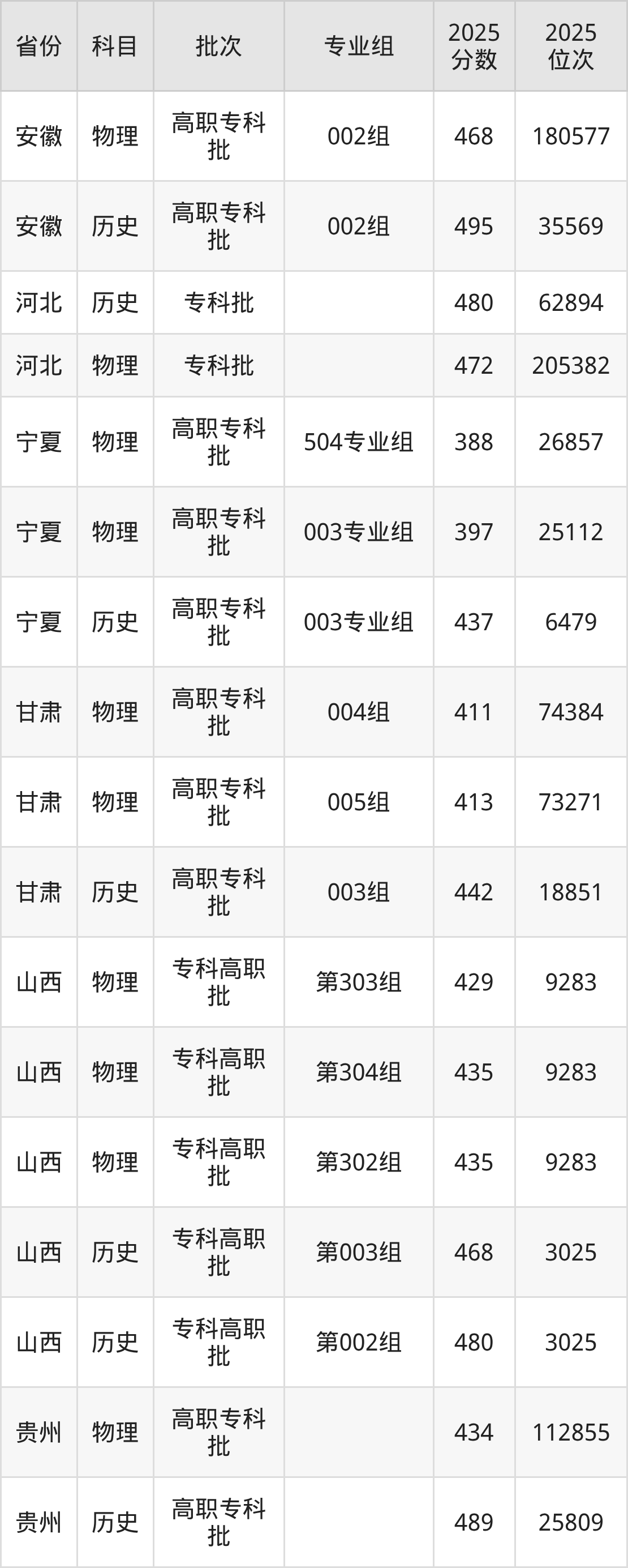 普通类专科物理类最低429分,专科历史类最低468分