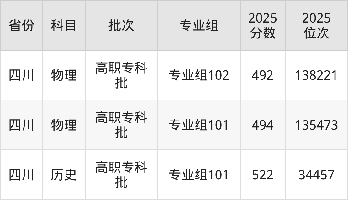 普通类专科物理类最低492分,专科历史类最低522分