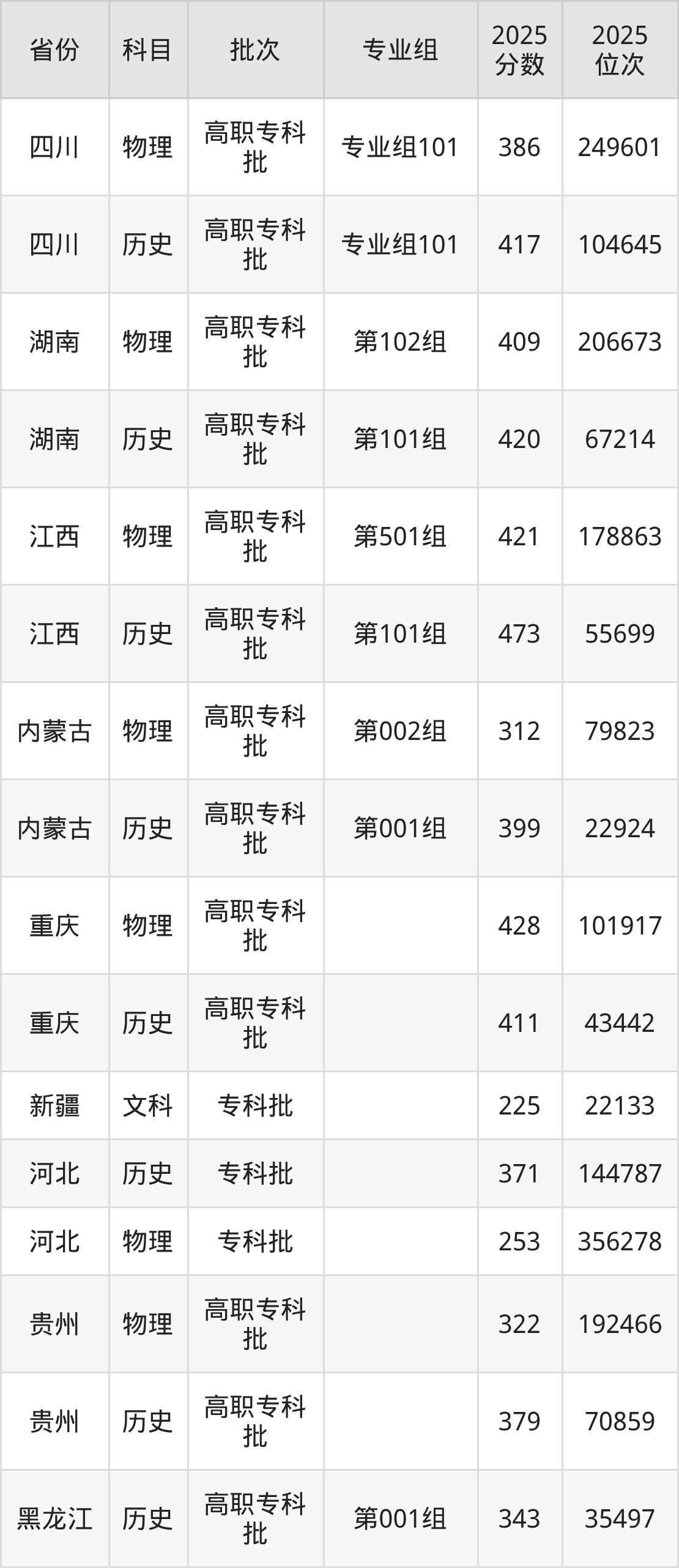 普通类专科物理类最低386分,专科历史类最低417分