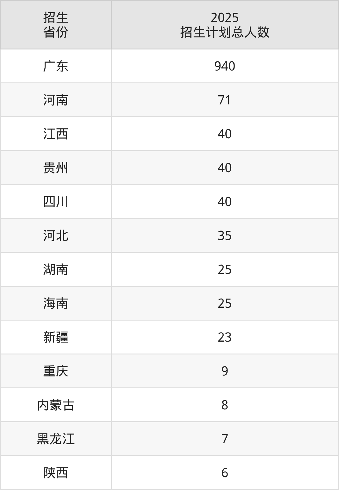 2025年广东南华工商职业学院面向全国13个省市开展专科招生;招生专业共26个,招生人数共1269人。2025年在广东省招生计划总人数是940人,其中,广东南华工商职业学院在广东省招生人数最多的是人工智能技术应用。广东南华工商职业学院在各省具体招生人数情况如下表。