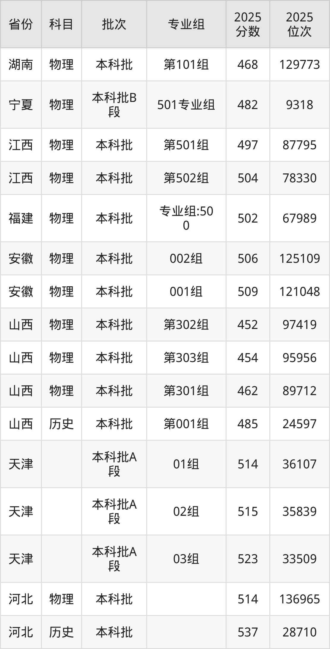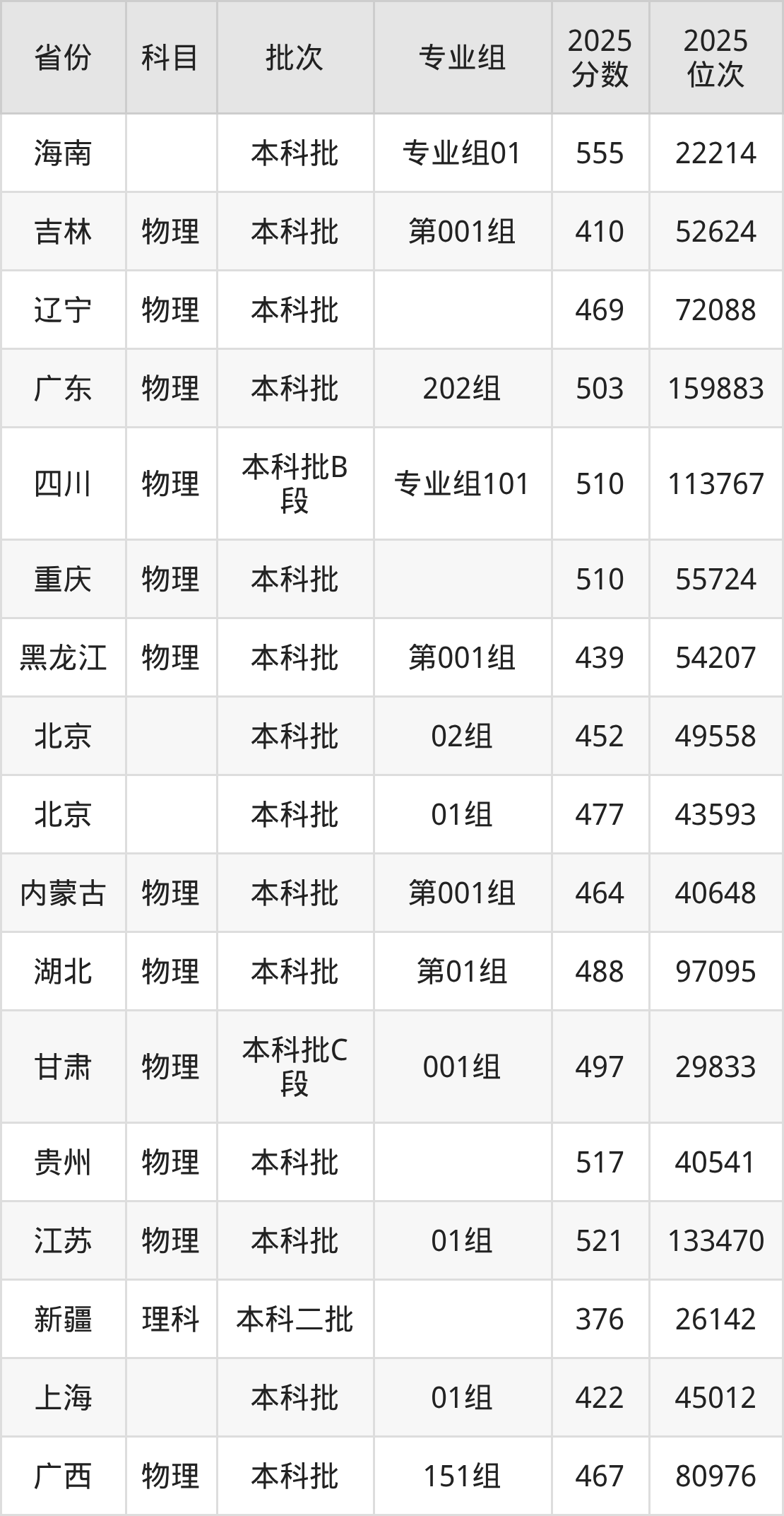 2025年在本科物理类进行招生,各专业组分数线详情如下: