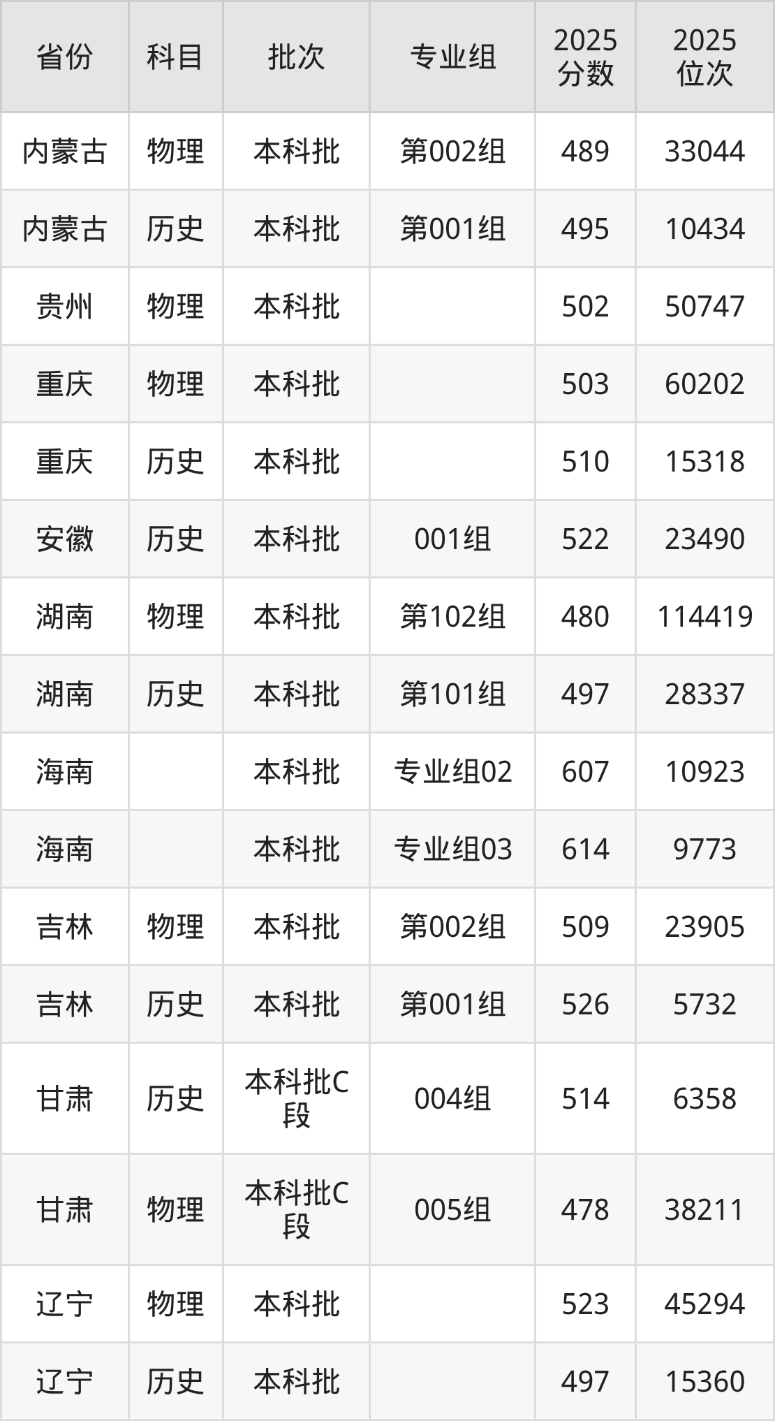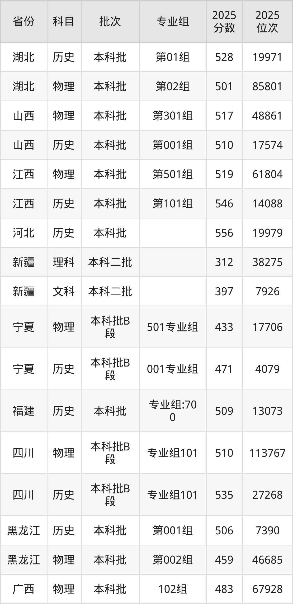 2025年投档录取最低分为312分,录取最低位次为38275名。