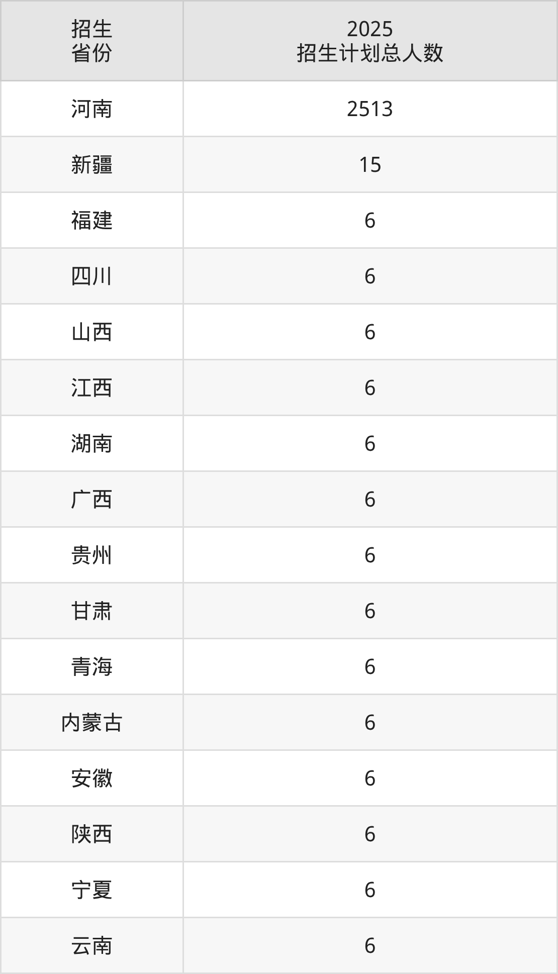 2025年郑州师范学院面向全国23个省市开展本科招生;招生专业共42个,招生人数共2652人。2025年在河南省招生计划总人数是2513人,其中,郑州师范学院在河南省招生人数最多的是汉语言文学。郑州师范学院在各省具体招生人数情况如下表。