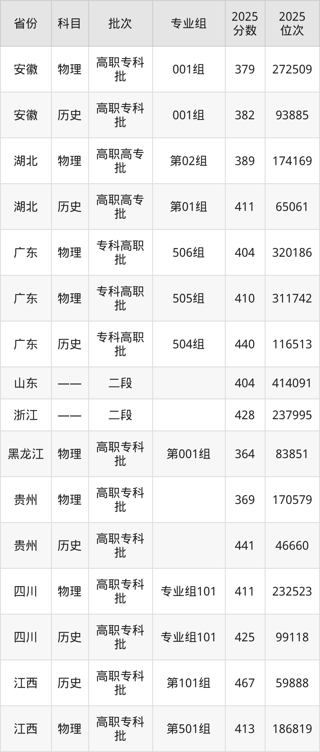 普通类专科物理类最低379分,专科历史类最低382分