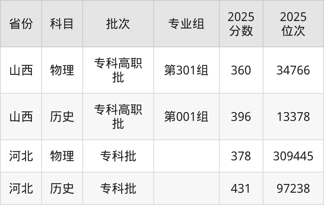 2025年在专科物理类进行招生,各专业组分数线详情如下: