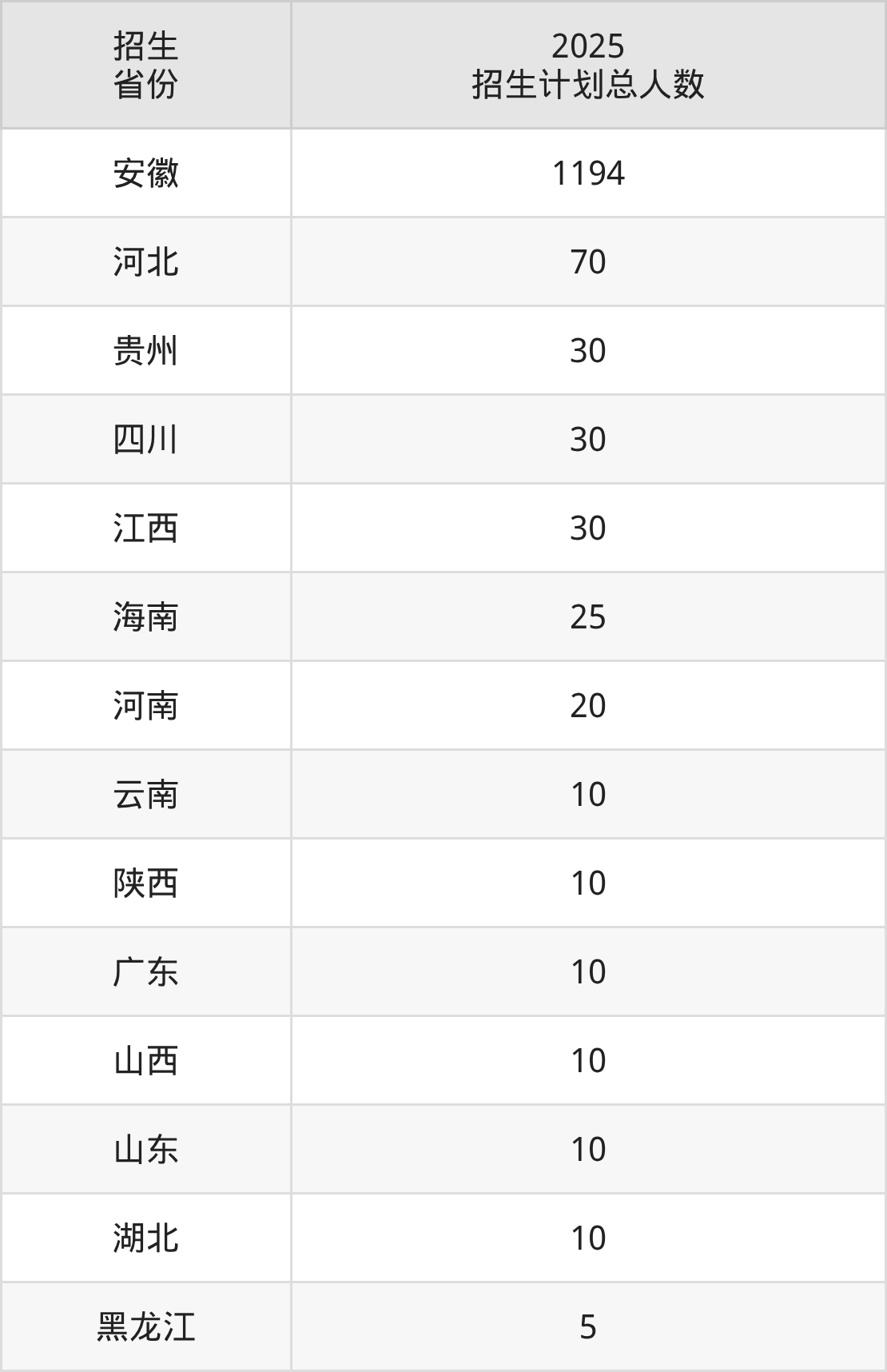 2025年淮南联合大学面向全国14个省市开展专科招生;招生专业共39个,招生人数共1464人。2025年在安徽省招生计划总人数是1194人,其中,淮南联合大学在安徽省招生人数最多的是护理。淮南联合大学在各省具体招生人数情况如下表。