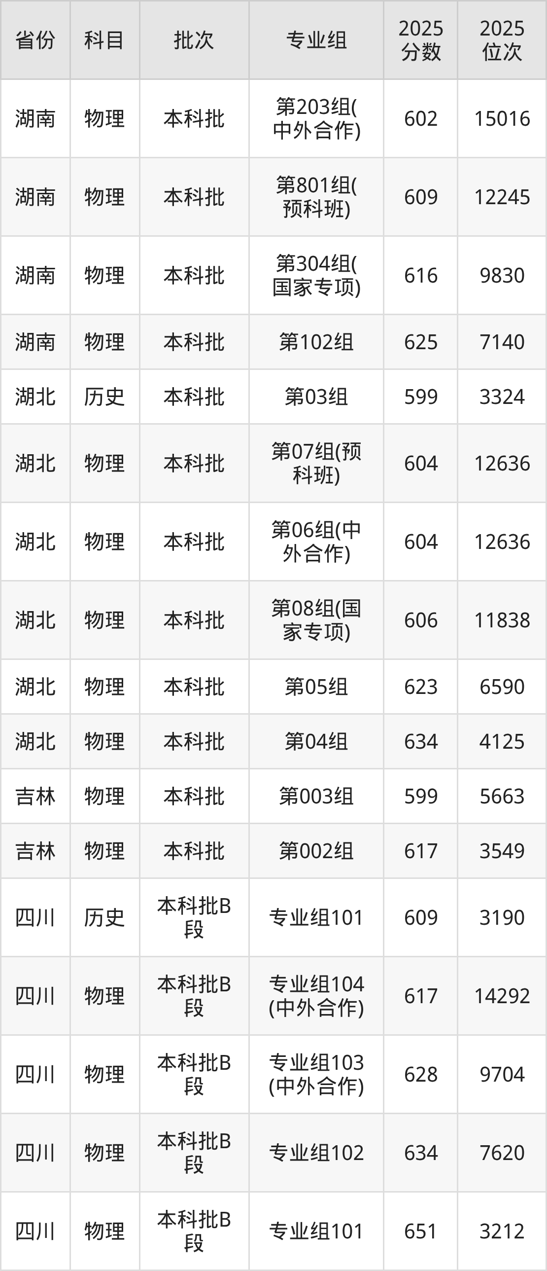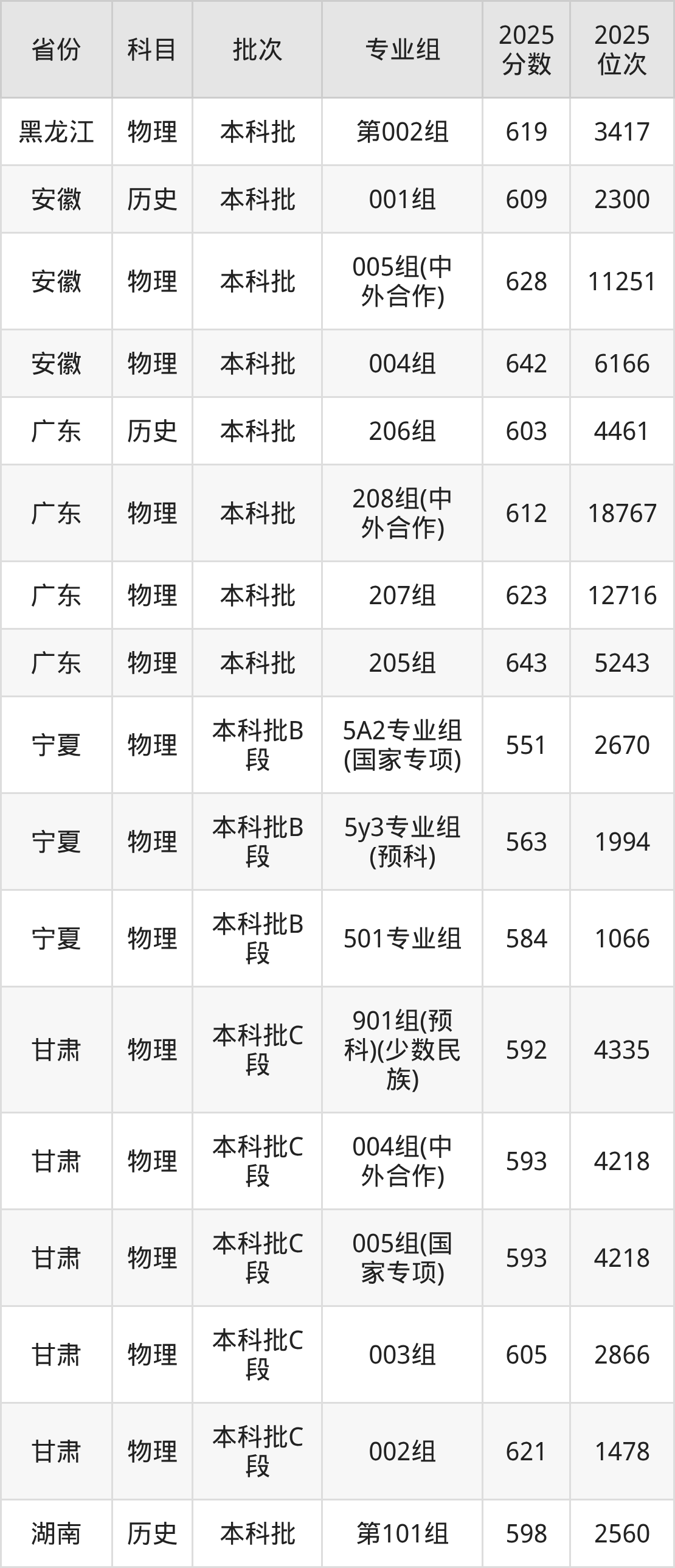 2025年在本科物理类进行招生,各专业组分数线详情如下: