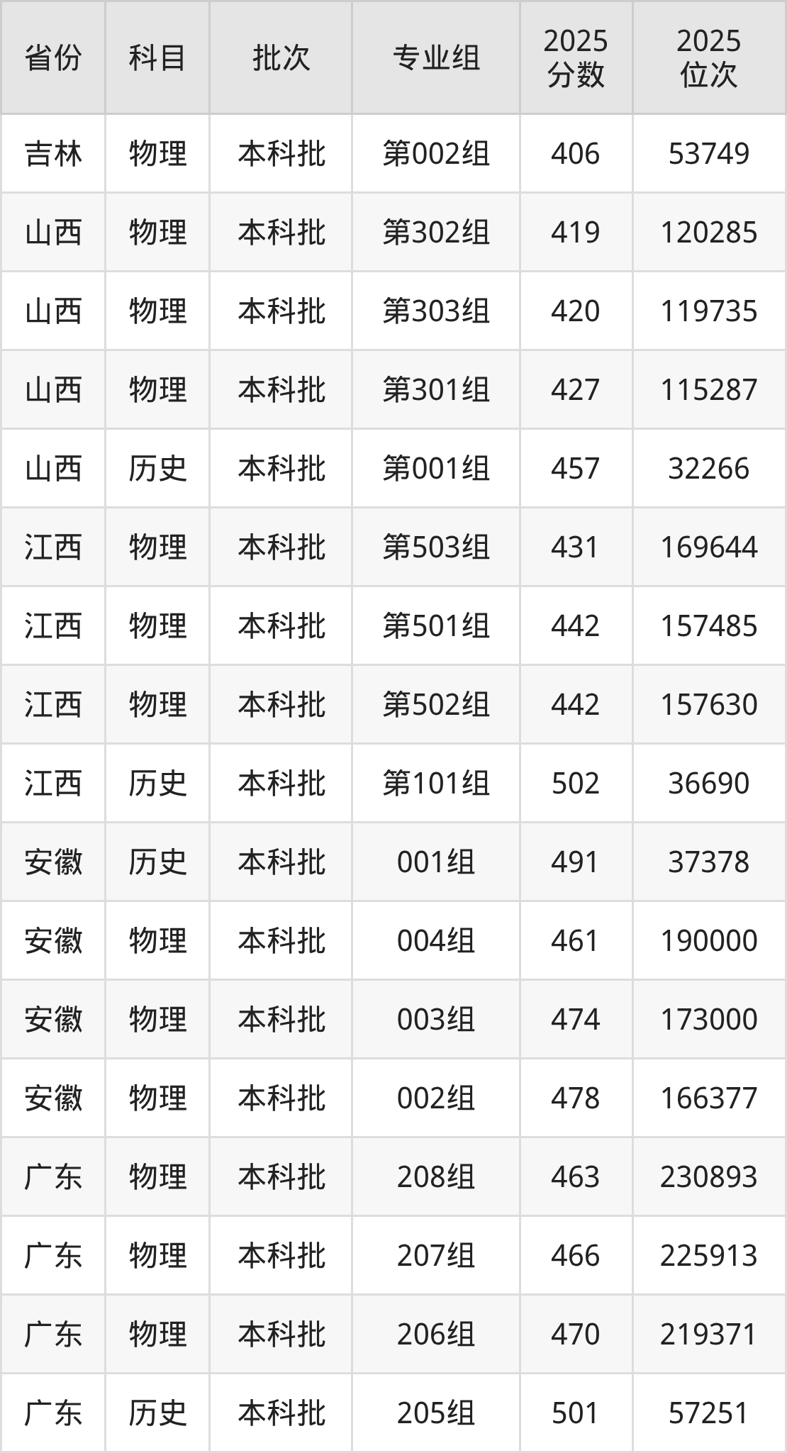 普通类本科物理类最低461分,本科历史类最低491分