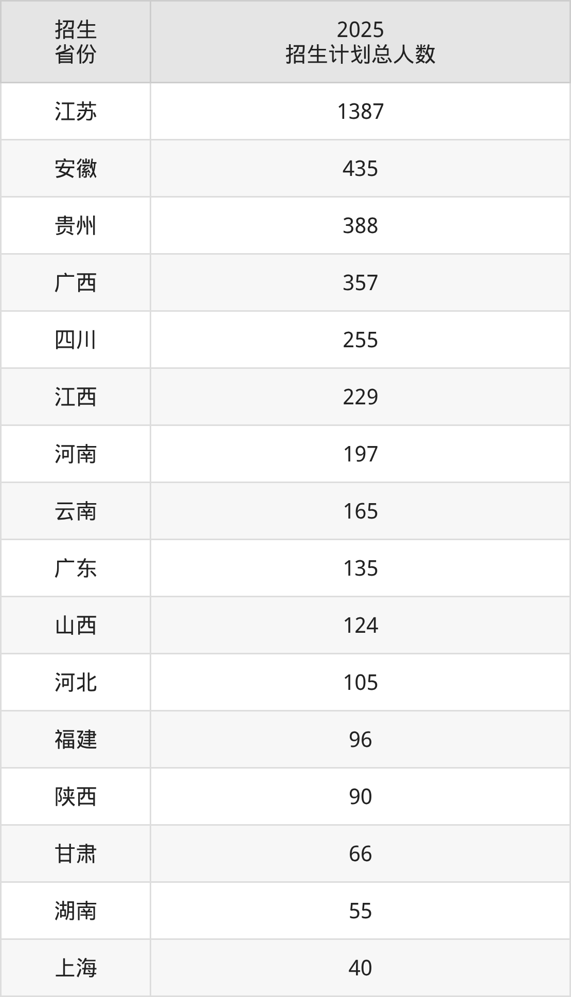 2025年无锡太湖学院面向全国26个省市开展本科招生;招生专业共35个,招生人数共4329人。2025年在江苏省招生计划总人数是1387人,其中,无锡太湖学院在江苏省招生人数最多的是护理学。无锡太湖学院在各省具体招生人数情况如下表。