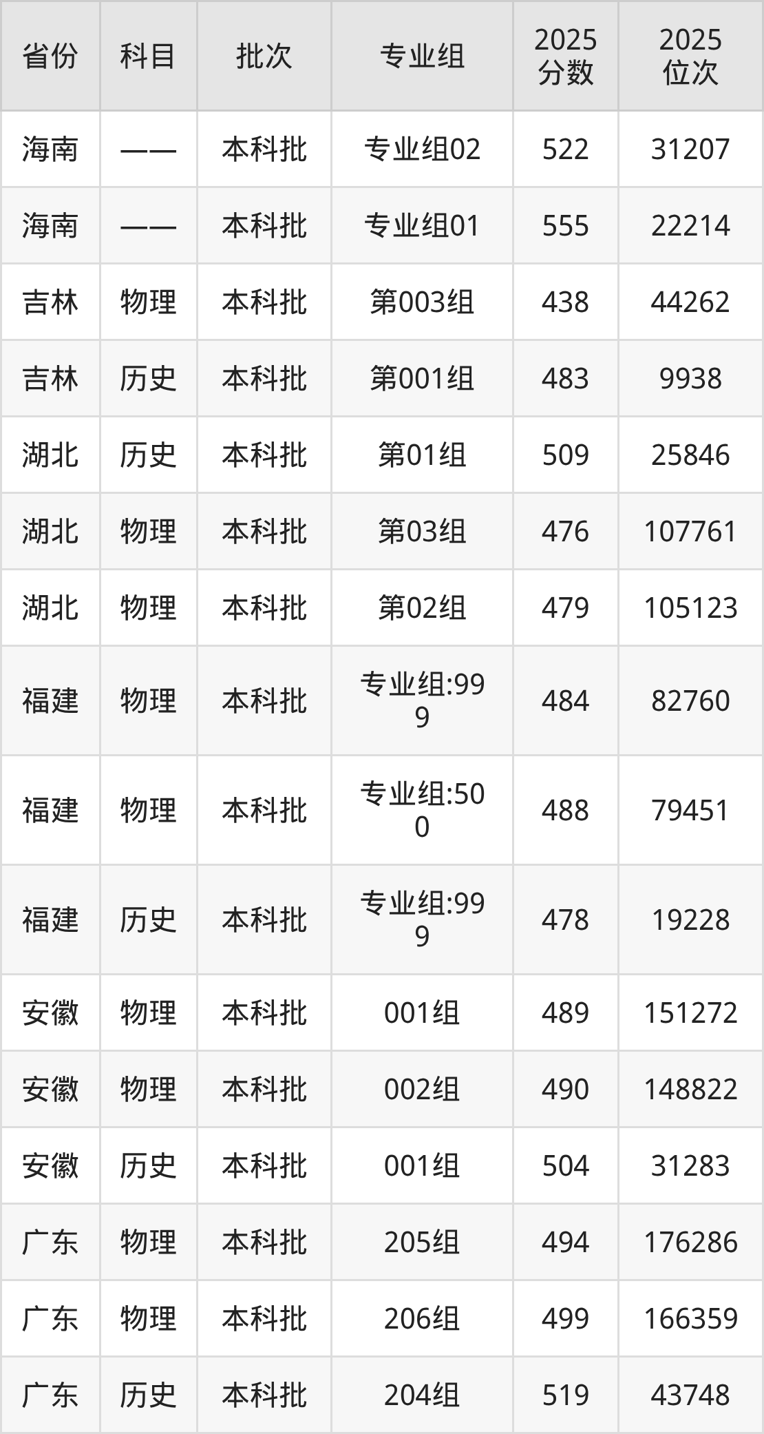 普通类本科物理类最低446分,本科历史类最低486分