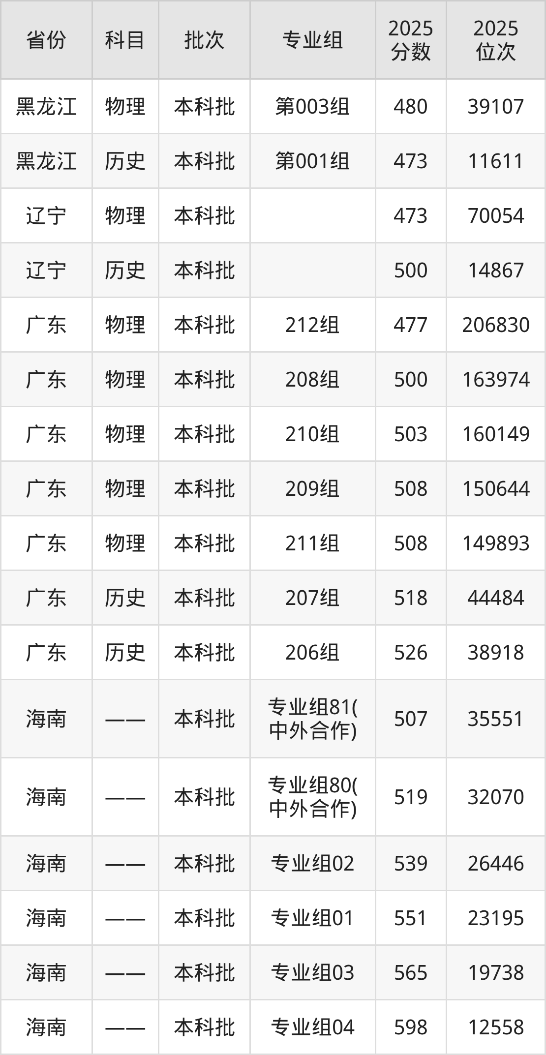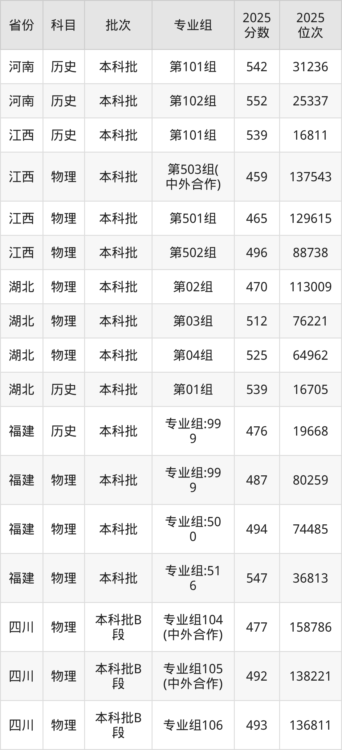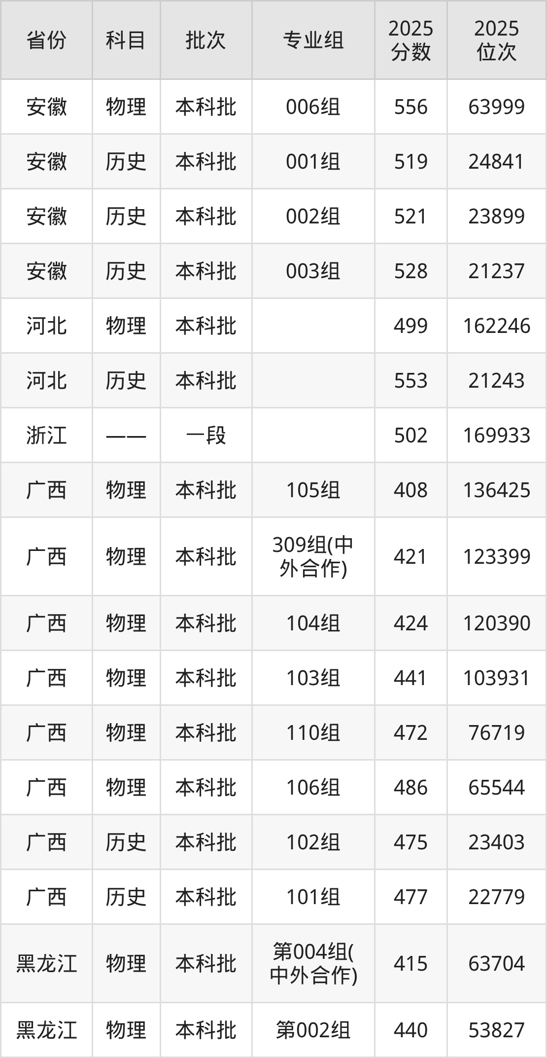 北华大学专业组102(中外合作):2025年投档录取最低分为539分,录取最低位次为25206名。