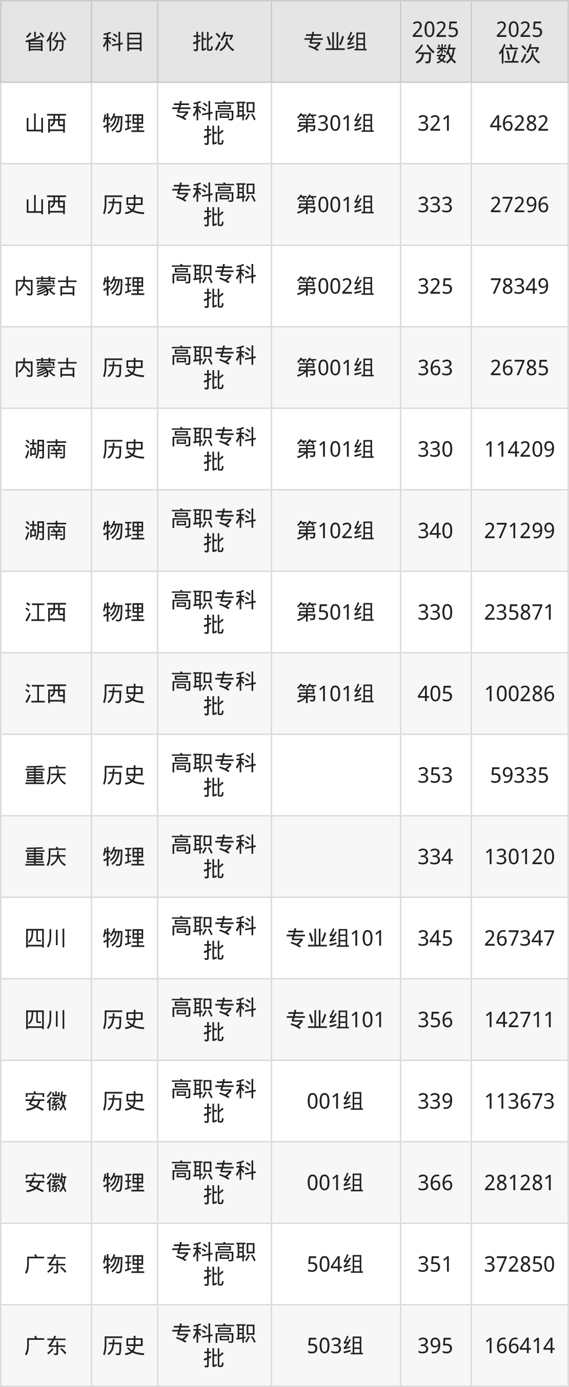 普通类专科物理类最低325分,专科历史类最低363分