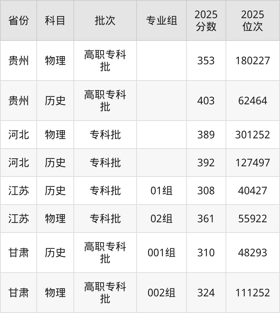 普通类专科物理类最低353分,专科历史类最低403分