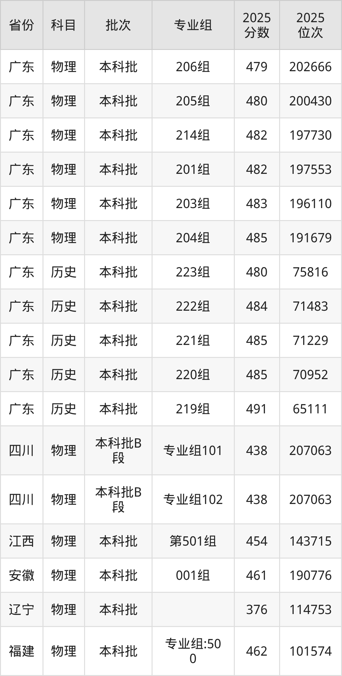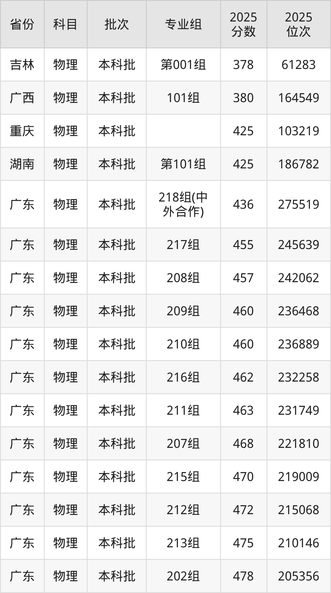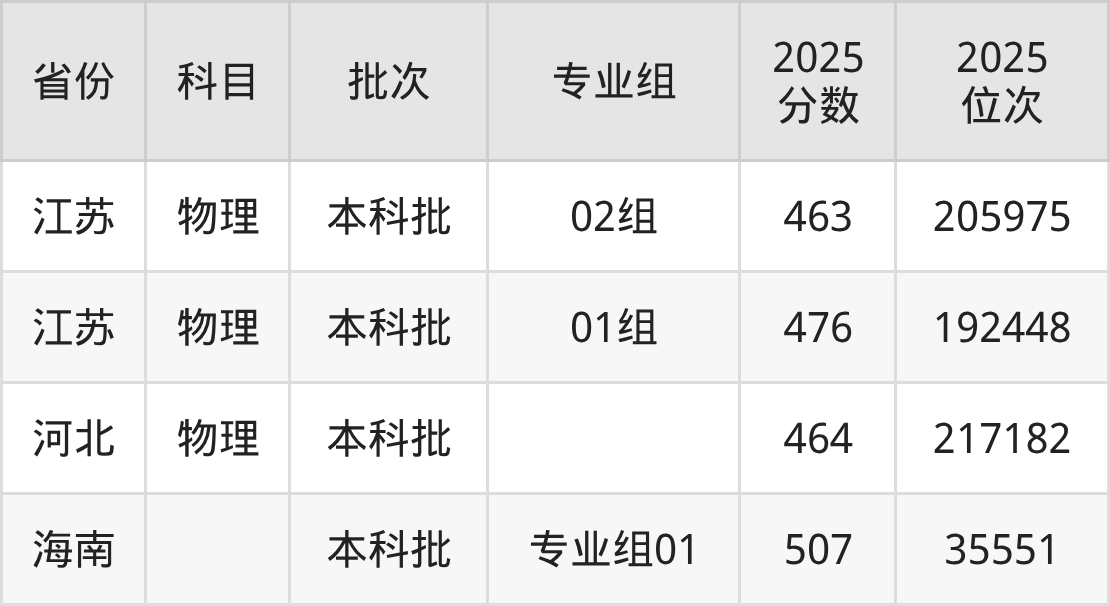 2025年在本科物理类进行招生,各专业组分数线详情如下: