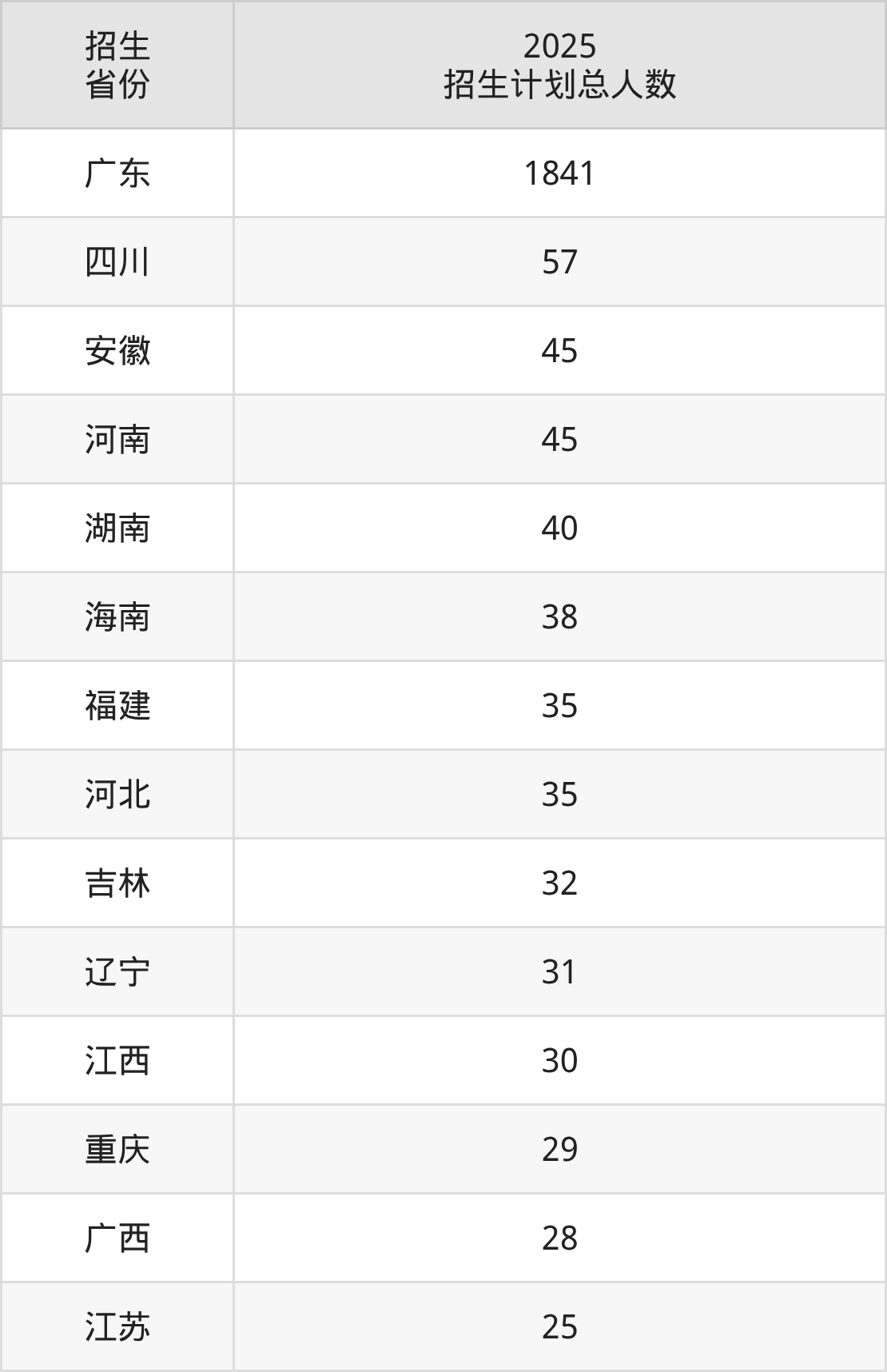 2025年广东东软学院面向全国14个省市开展本科招生;招生专业共18个,招生人数共2245人。2025年在广东省招生计划总人数是1841人,其中,广东东软学院在广东省招生人数最多的是软件工程。广东东软学院在各省具体招生人数情况如下表。