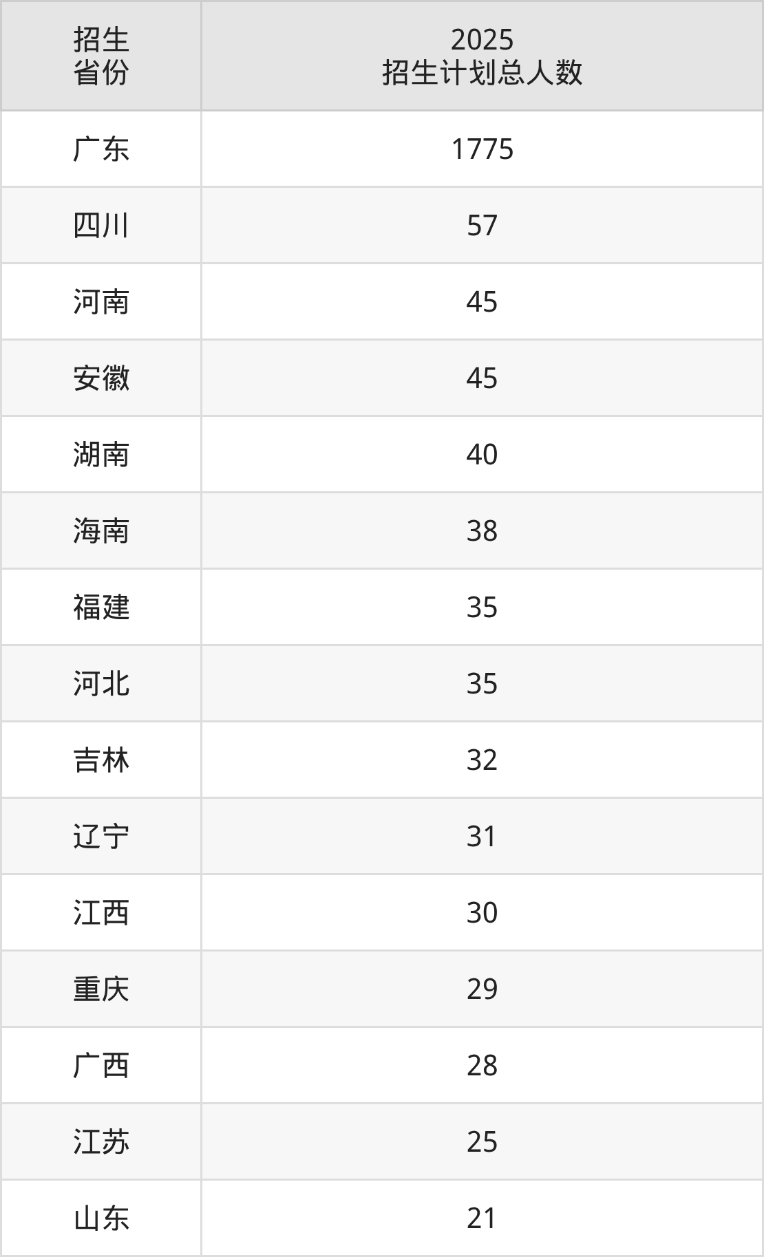 2025年广东东软学院面向全国15个省市开展本科招生;招生专业共18个,招生人数共2266人。2025年在广东省招生计划总人数是1775人,其中,广东东软学院在广东省招生人数最多的是软件工程。广东东软学院在各省具体招生人数情况如下表。