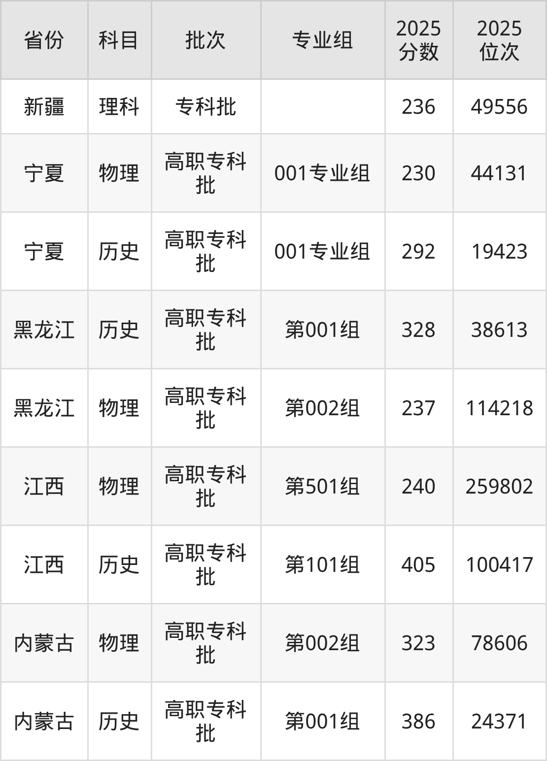 普通类专科物理类最低237分,专科历史类最低328分