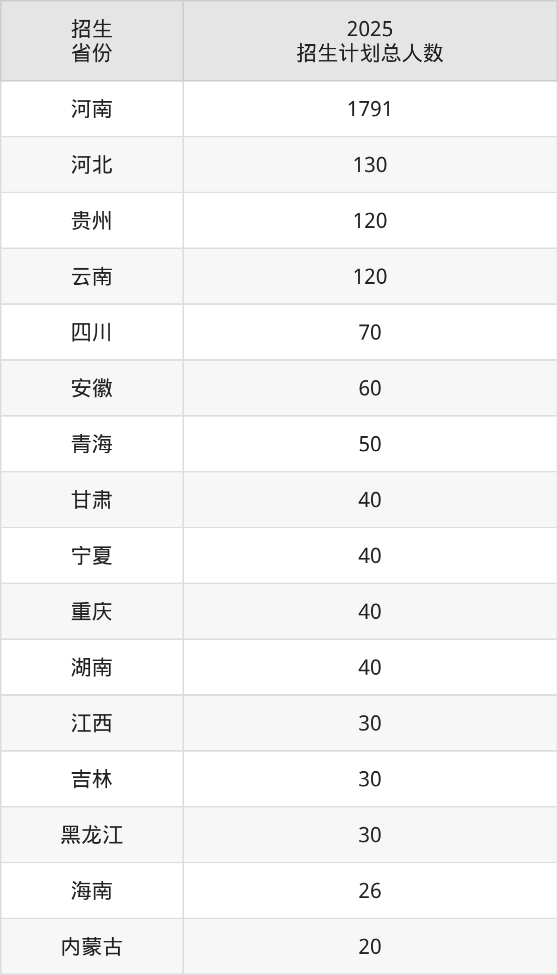 2025年鹤壁职业技术学院面向全国17个省市开展专科招生;招生专业共46个,招生人数共2639人。2025年在河南省招生计划总人数是1791人,其中,鹤壁职业技术学院在河南省招生人数最多的是护理。鹤壁职业技术学院在各省具体招生人数情况如下表。