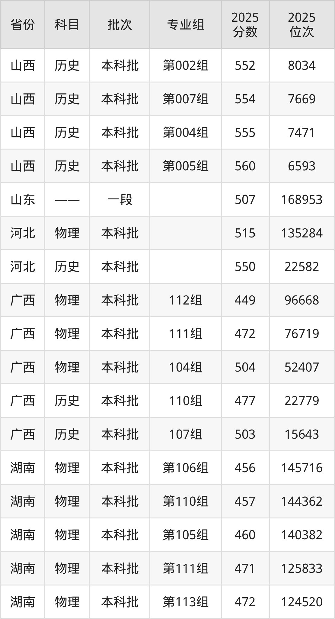 2025年投档录取最低分为550分,录取最低位次为22582名。