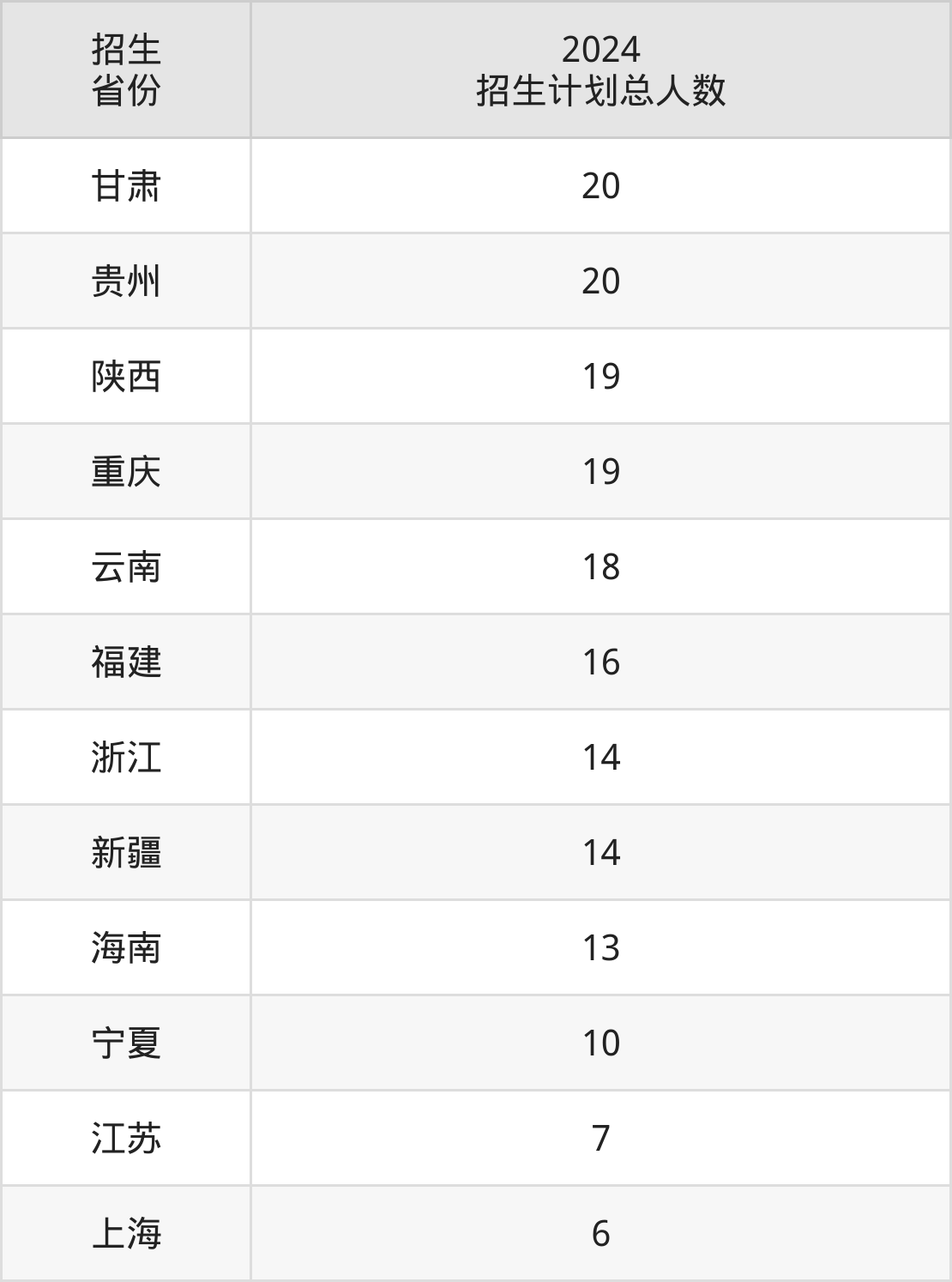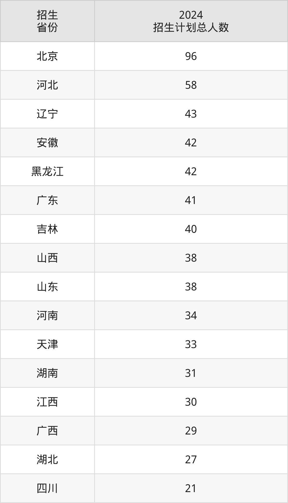 2024年北京邮电大学(宏福校区)面向全国28个省市开展本科招生;招生专业共6个,招生人数共819人。2024年在北京市招生计划总人数是96人,其中,北京邮电大学(宏福校区)在北京市招生人数最多的是电信工程及管理。北京邮电大学(宏福校区)在各省具体招生人数情况如下表。