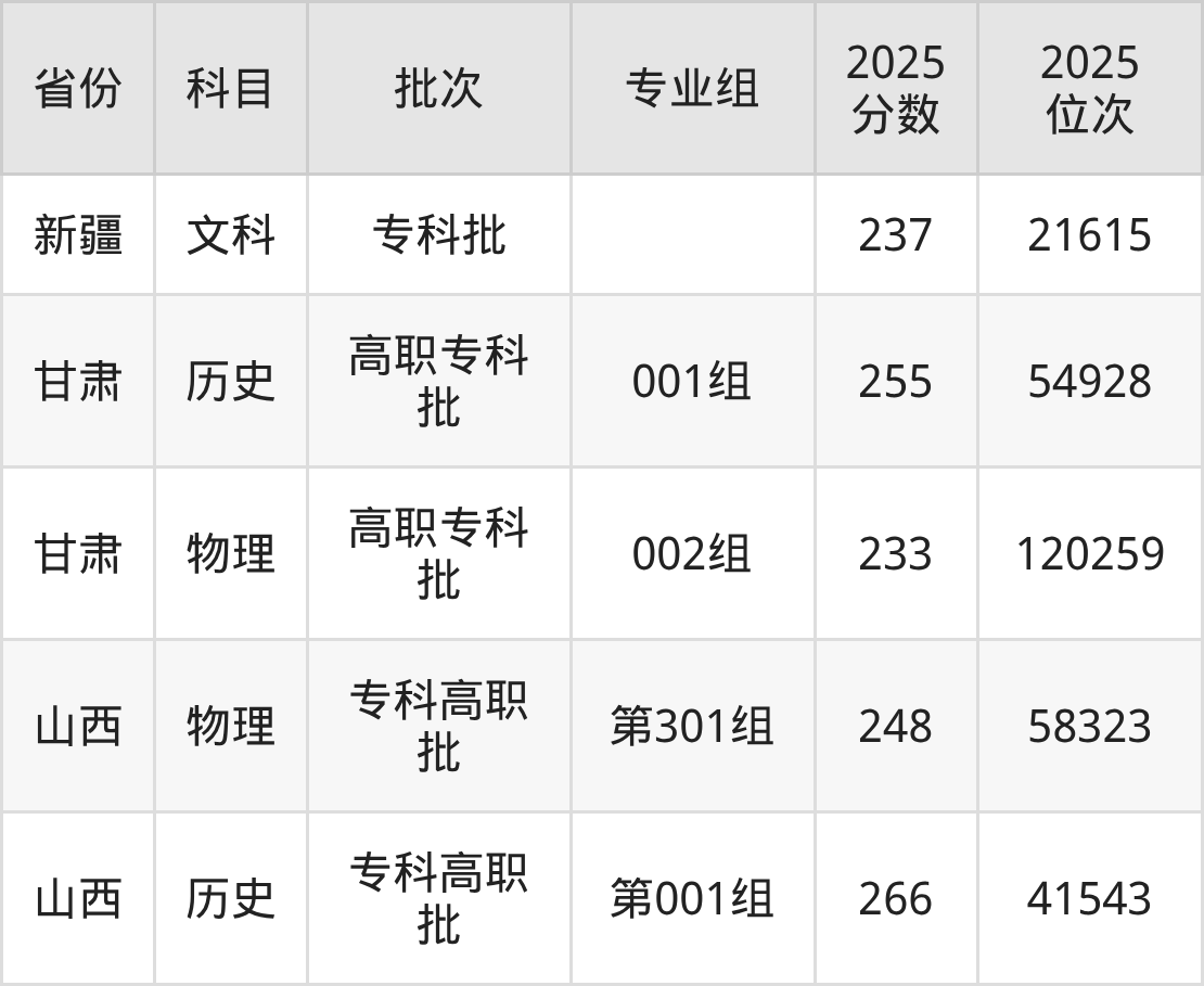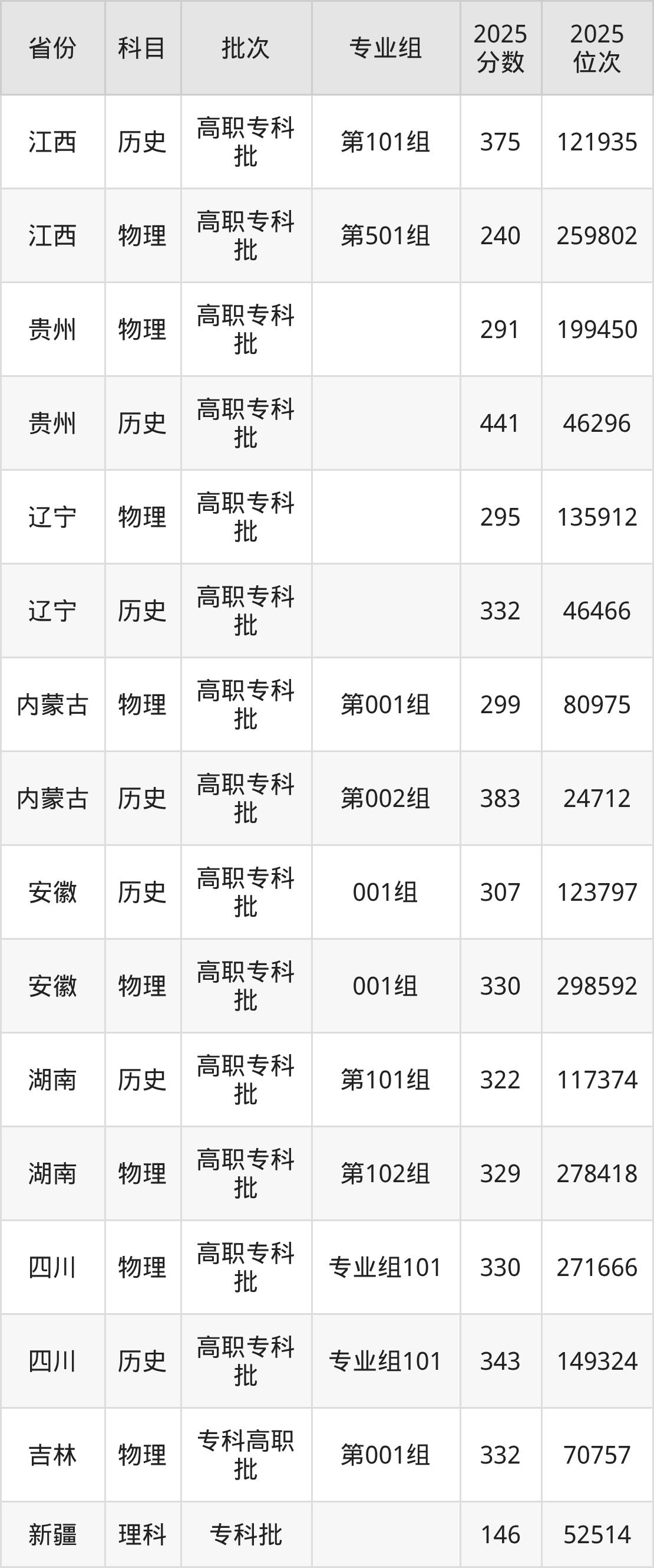 2025年在专科物理类进行招生,各专业组分数线详情如下: