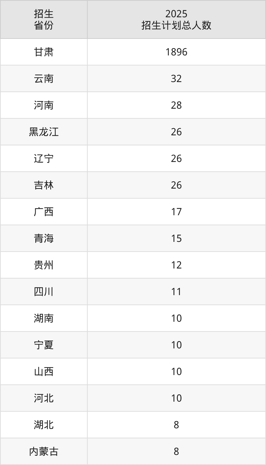 2025年甘肃民族师范学院面向全国20个省市开展本科招生;招生专业共29个,招生人数共2164人。2025年在甘肃省招生计划总人数是1896人,其中,甘肃民族师范学院在甘肃省招生人数最多的是中国少数民族语言文学。甘肃民族师范学院在各省具体招生人数情况如下表。