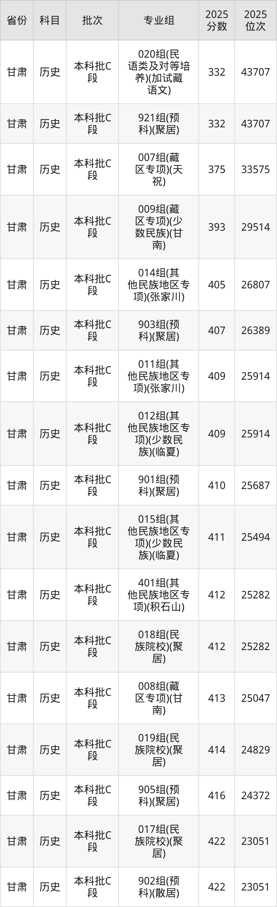 甘肃民族师范学院020专业组(民语类及对等培养)(加试藏语文):2025年投档录取最低分为332分,录取最低位次为43707名。