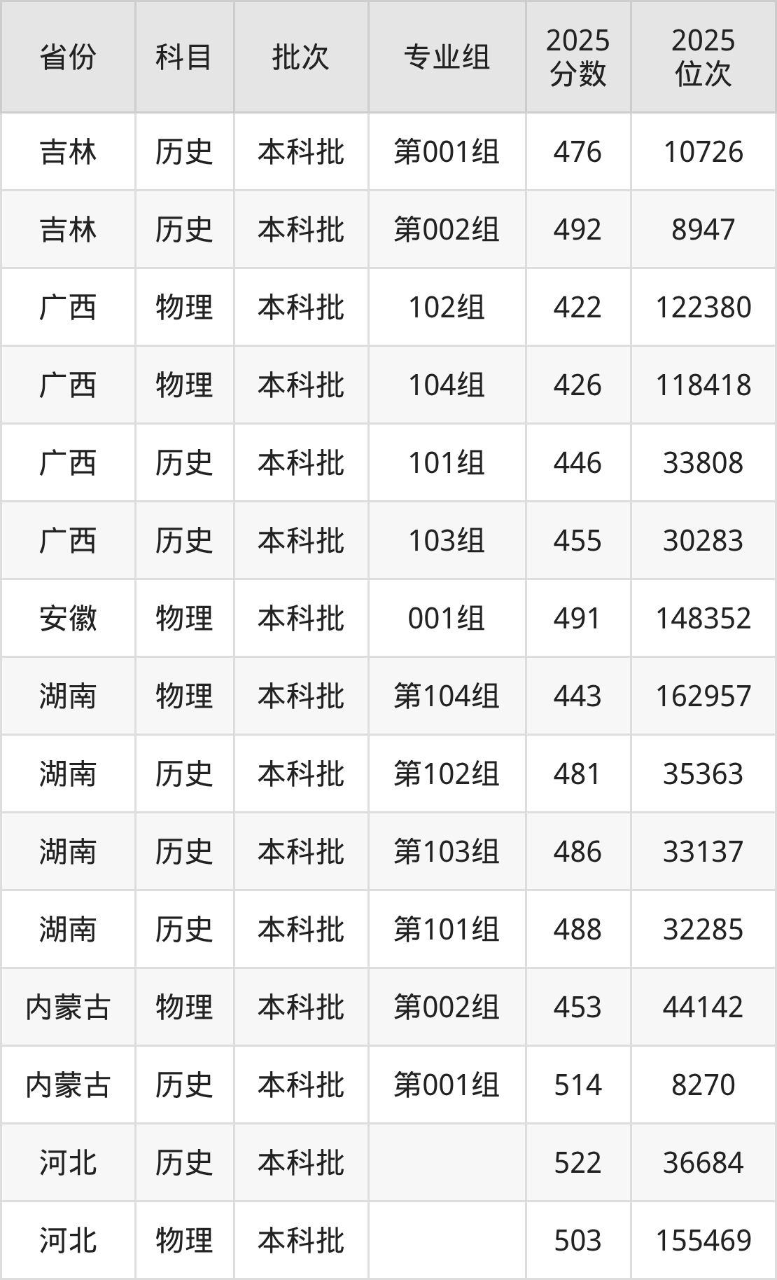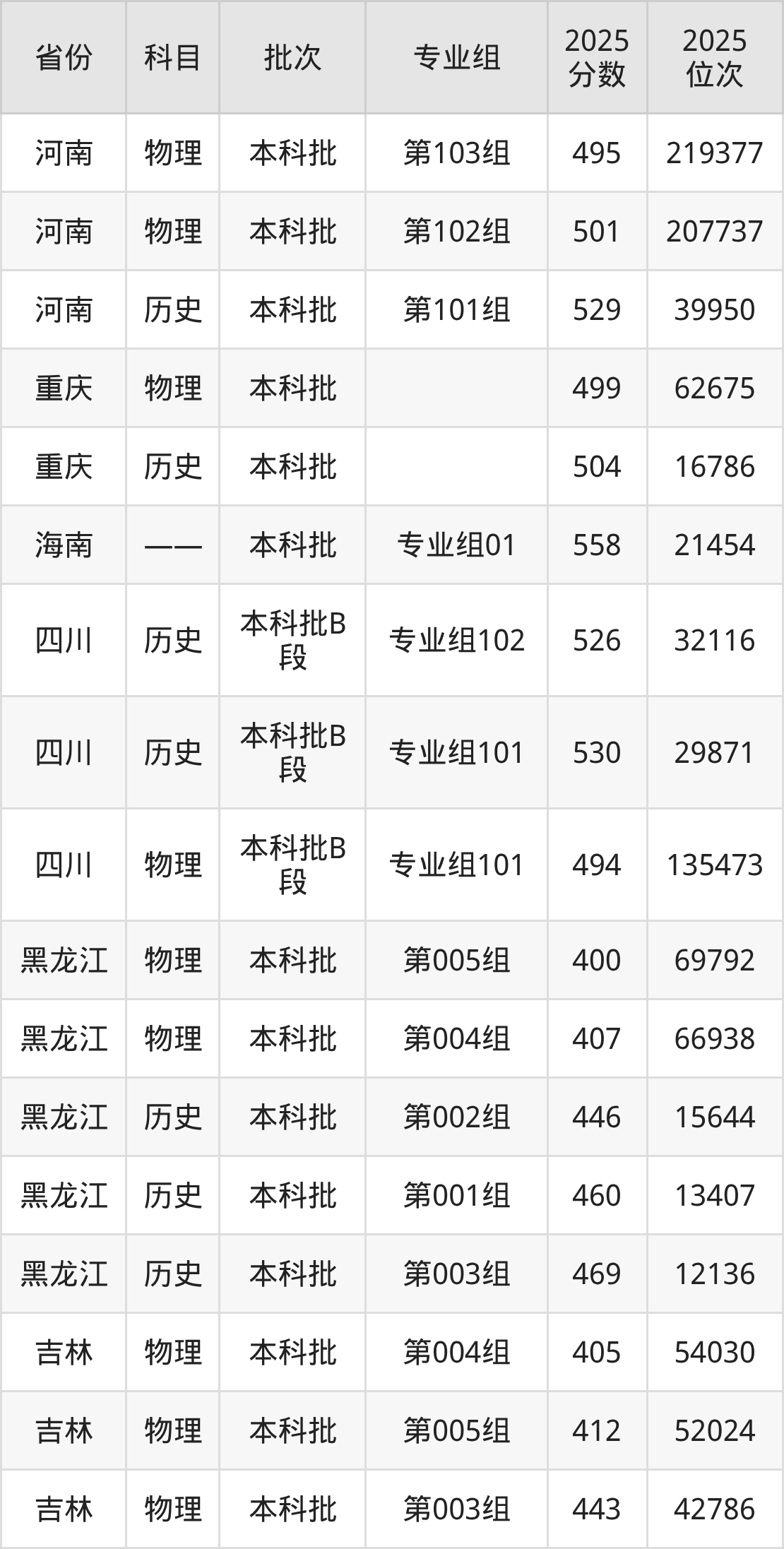 2025年投档录取最低分为489分,录取最低位次为16852名。