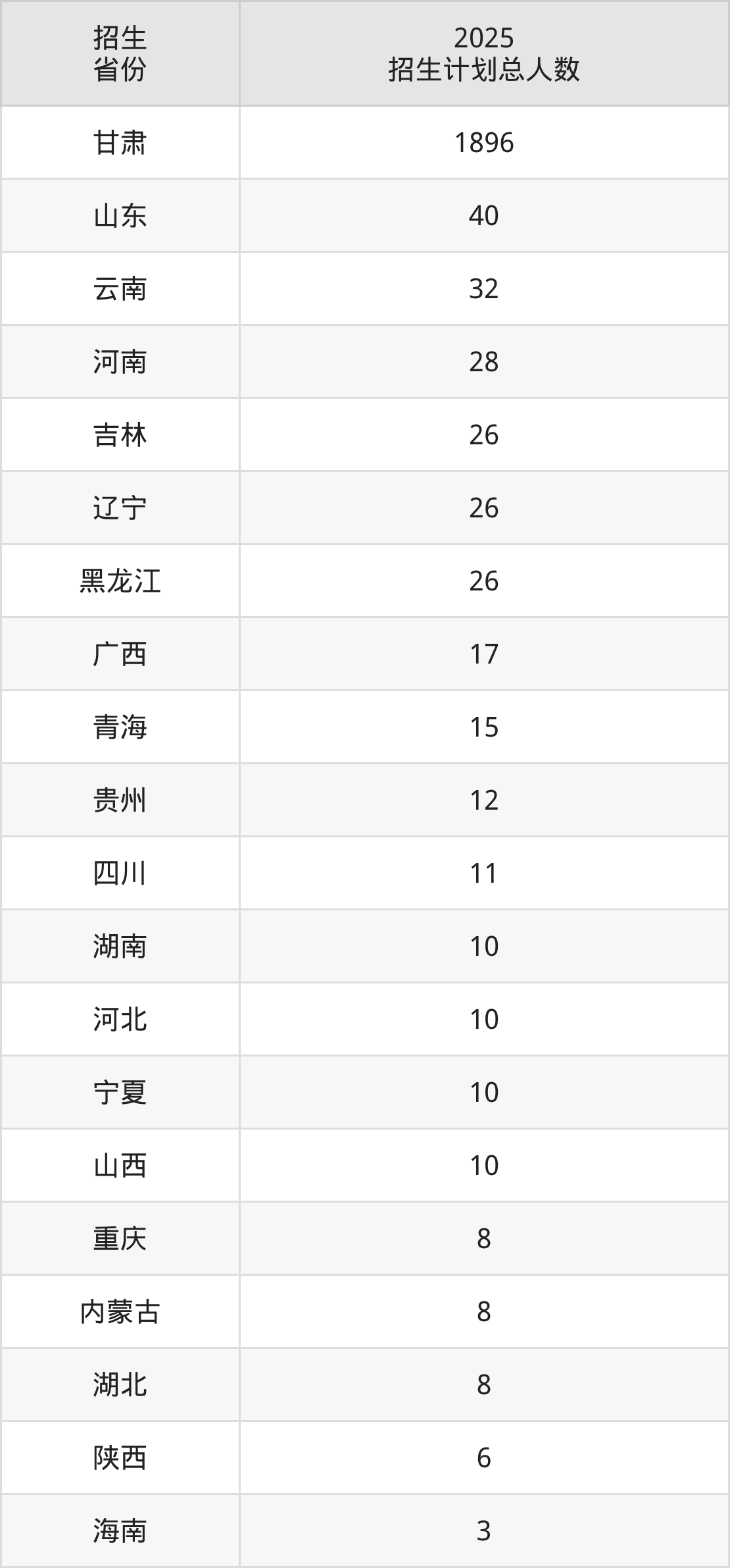 2025年甘肃民族师范学院面向全国21个省市开展本科招生;招生专业共29个,招生人数共2204人。2025年在甘肃省招生计划总人数是1896人,其中,甘肃民族师范学院在甘肃省招生人数最多的是中国少数民族语言文学。甘肃民族师范学院在各省具体招生人数情况如下表。