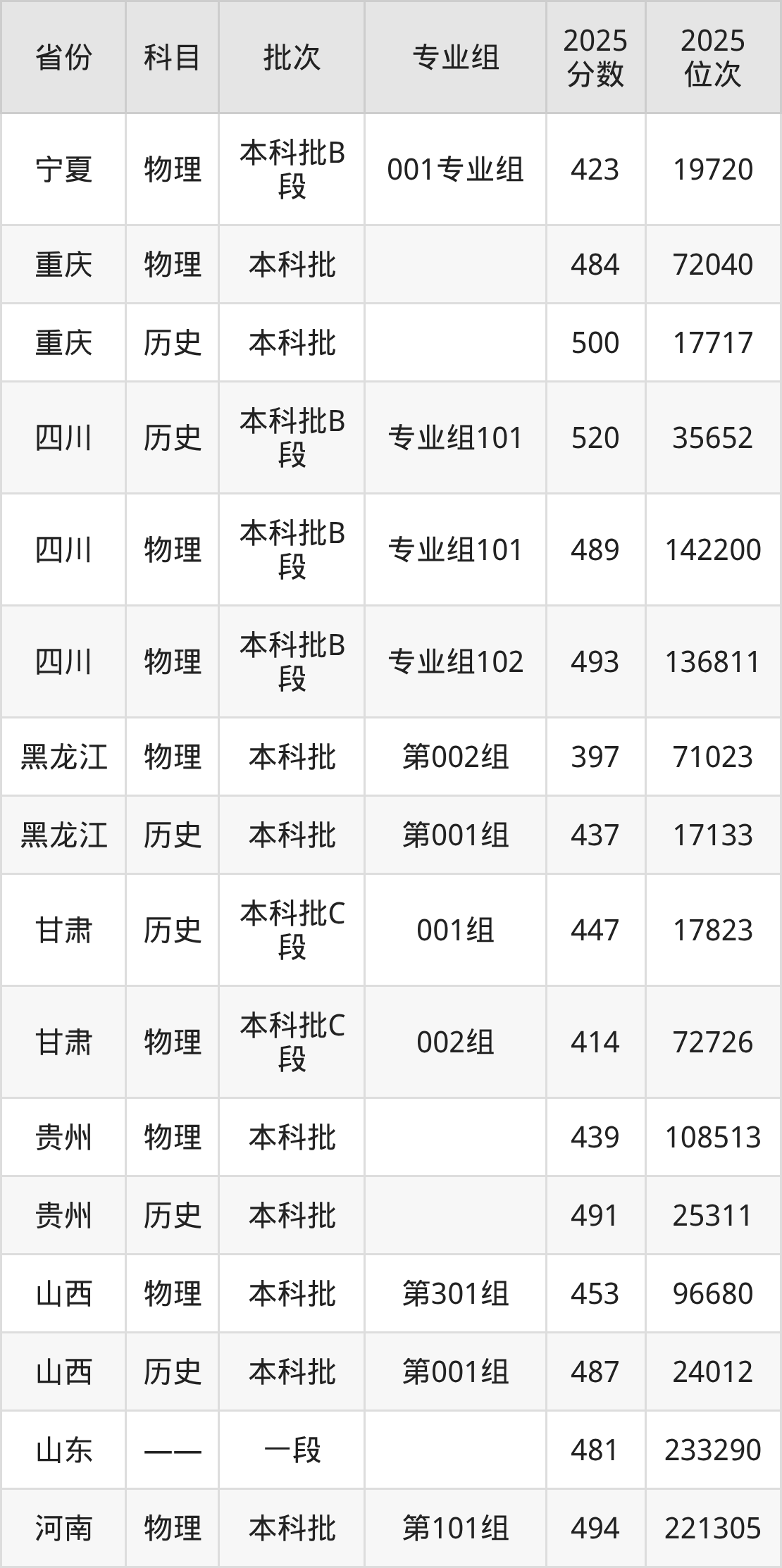 2025年在本科物理类进行招生,各专业组分数线详情如下: