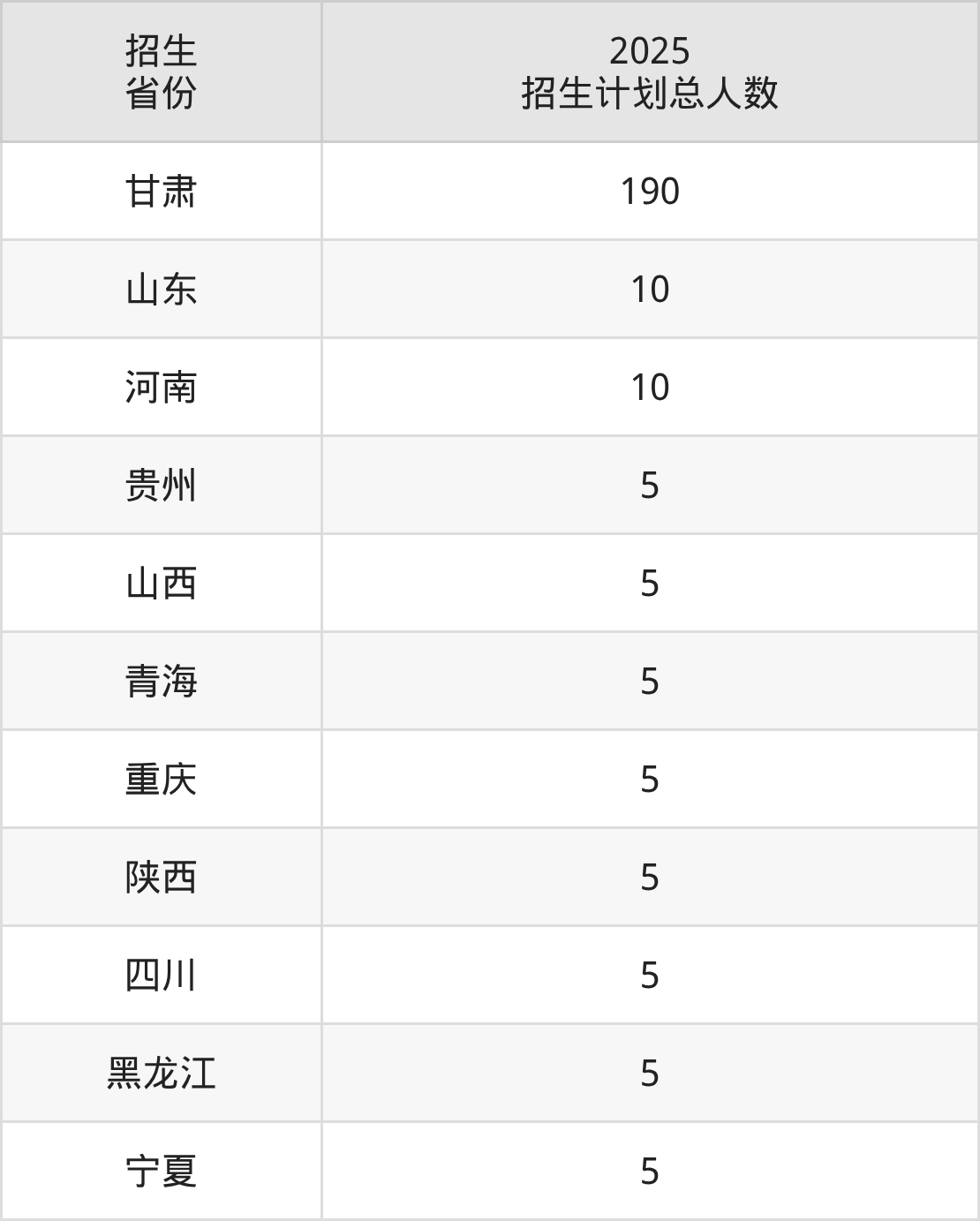 2025年酒泉职业技术大学面向全国11个省市开展本科招生;招生专业共5个,招生人数共250人。2025年在甘肃省招生计划总人数是190人,其中,酒泉职业技术大学在甘肃省招生人数最多的是新能源发电工程技术。酒泉职业技术大学在各省具体招生人数情况如下表。