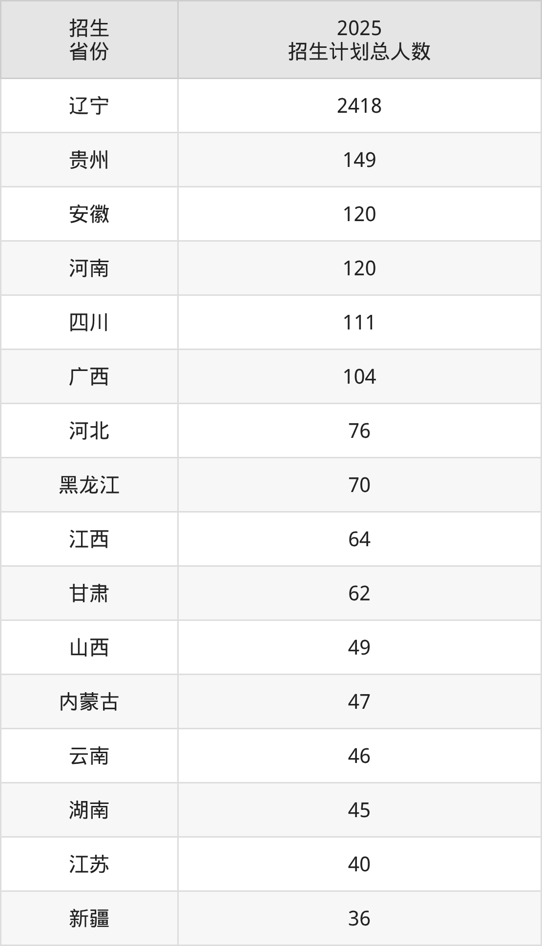2025年沈阳师范大学面向全国25个省市开展本科招生;招生专业共42个,招生人数共3625人。2025年在辽宁省招生计划总人数是2418人,其中,沈阳师范大学在辽宁省招生人数最多的是化学。沈阳师范大学在各省具体招生人数情况如下表。
