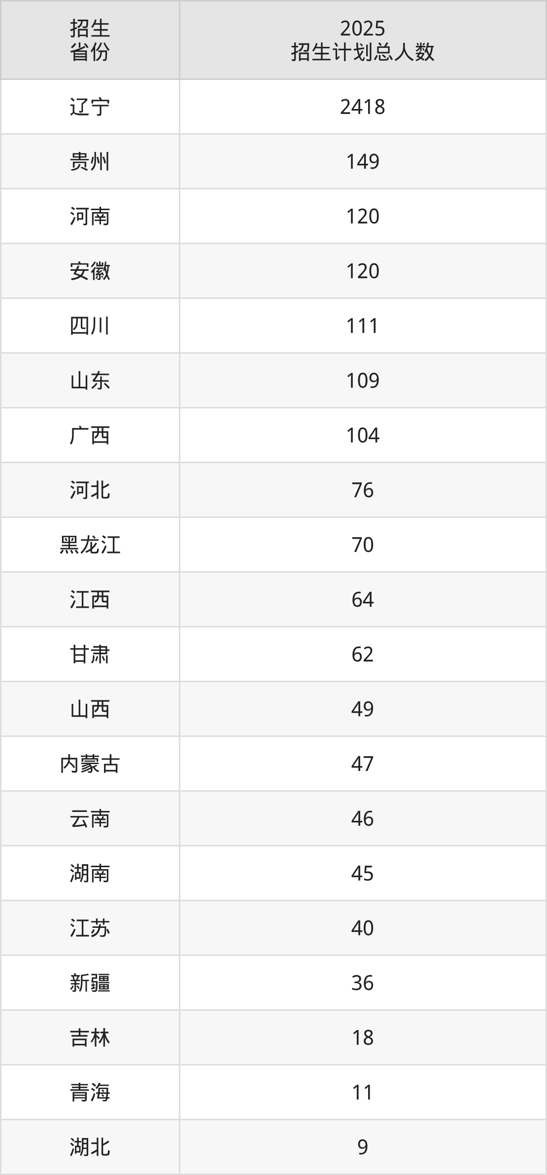 2025年沈阳师范大学面向全国26个省市开展本科招生;招生专业共42个,招生人数共3734人。2025年在辽宁省招生计划总人数是2418人,其中,沈阳师范大学在辽宁省招生人数最多的是化学。沈阳师范大学在各省具体招生人数情况如下表。