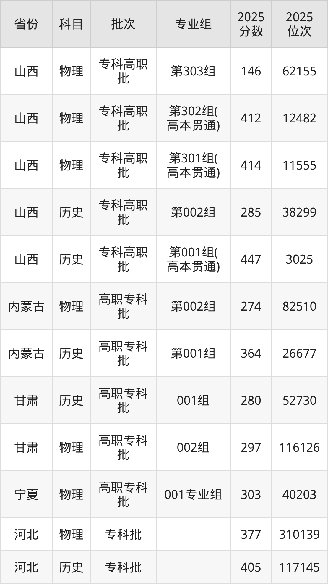 2025年在专科物理类进行招生,各专业组分数线详情如下: