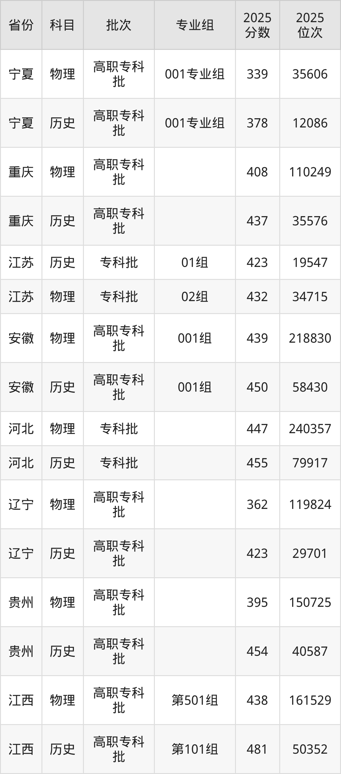 2025年湖南大众传媒职业技术学院全国录取分数线是339分到481分,录取最低在宁夏物理类(001专业组)、录取最高在江西历史类(第101组)。各省各专业组最低分具有差异,详情如下:
