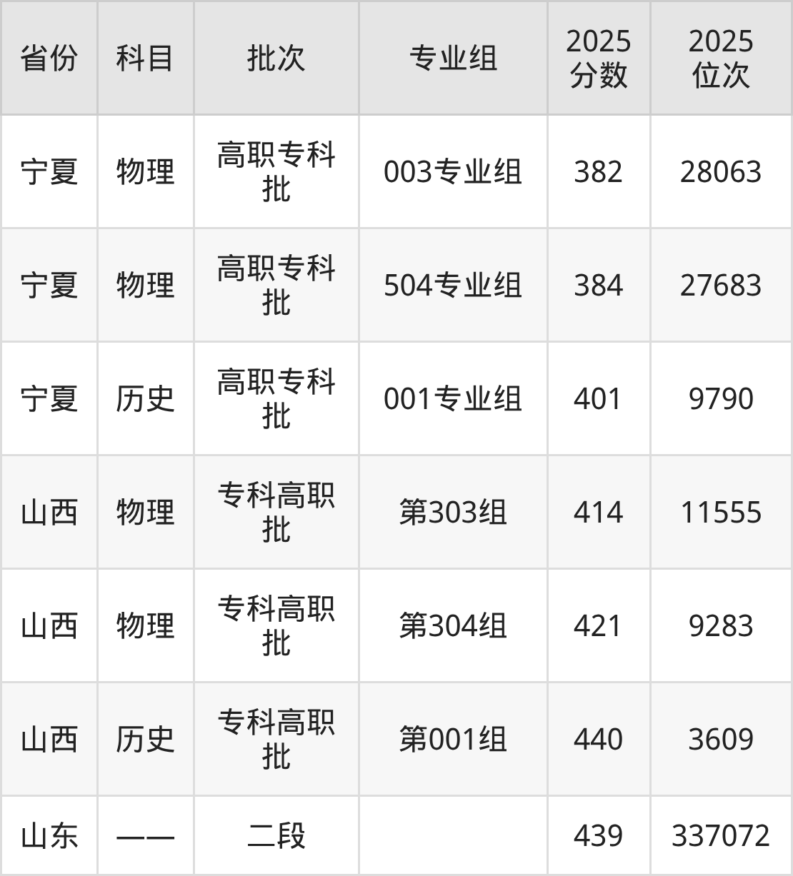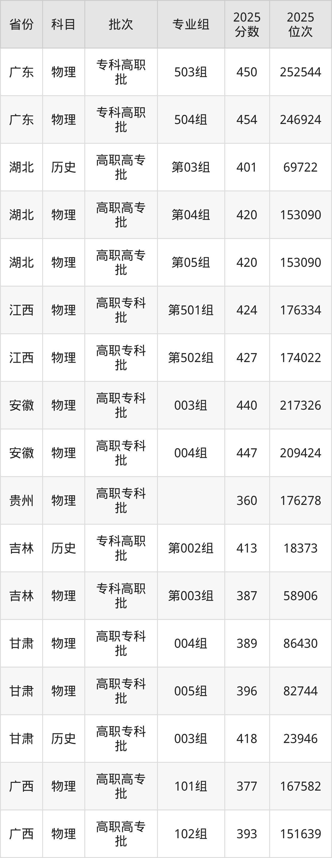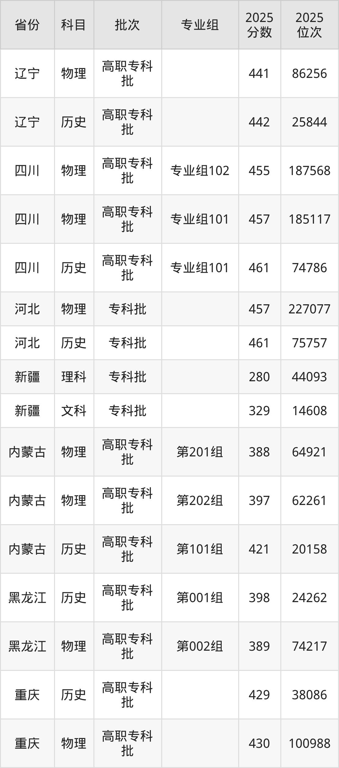 2025年在专科物理类进行招生,各专业组分数线详情如下: