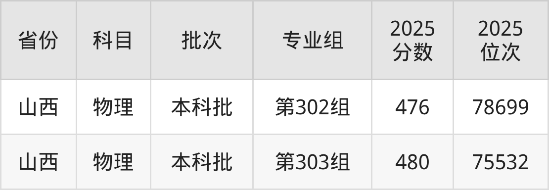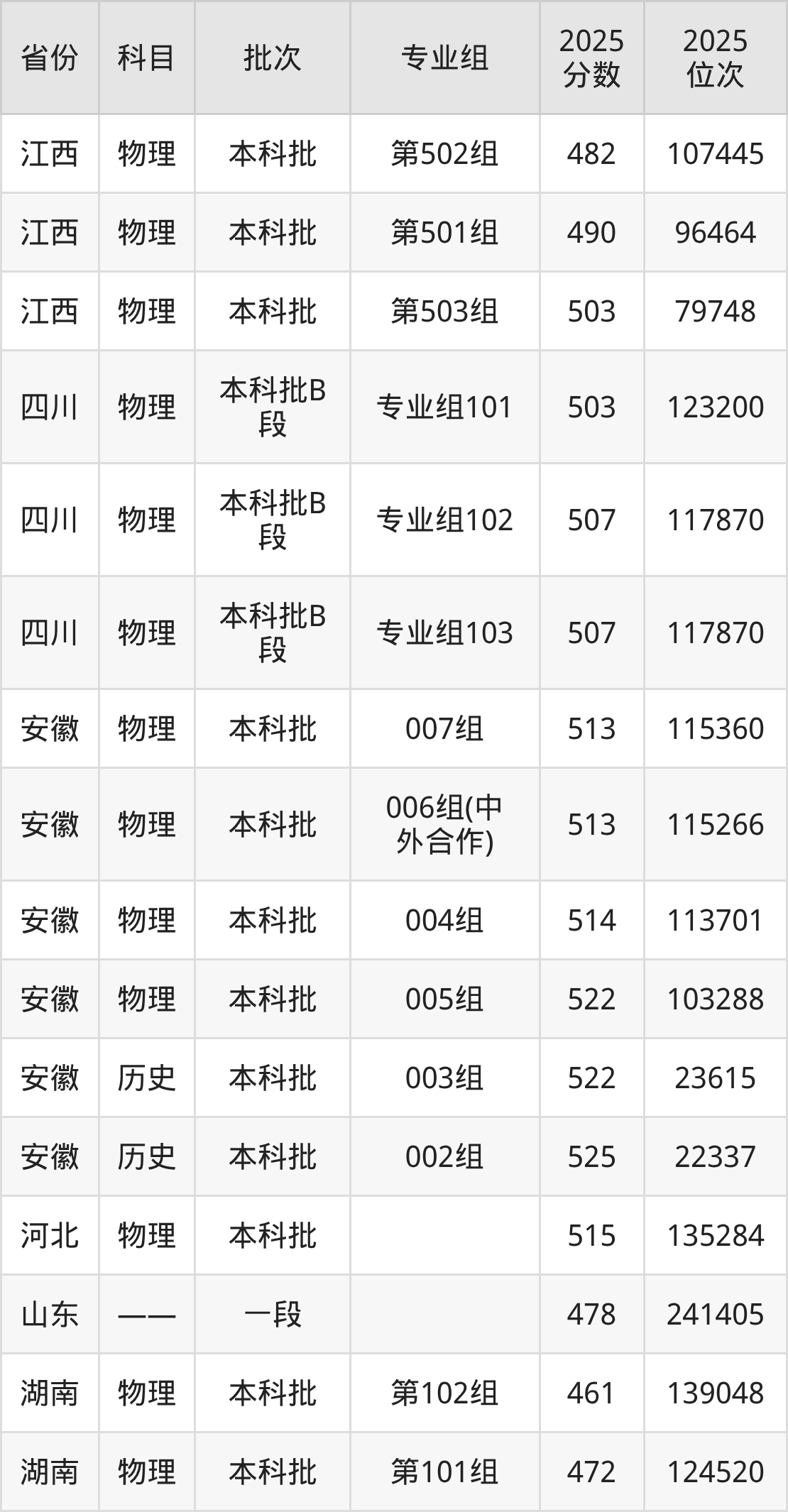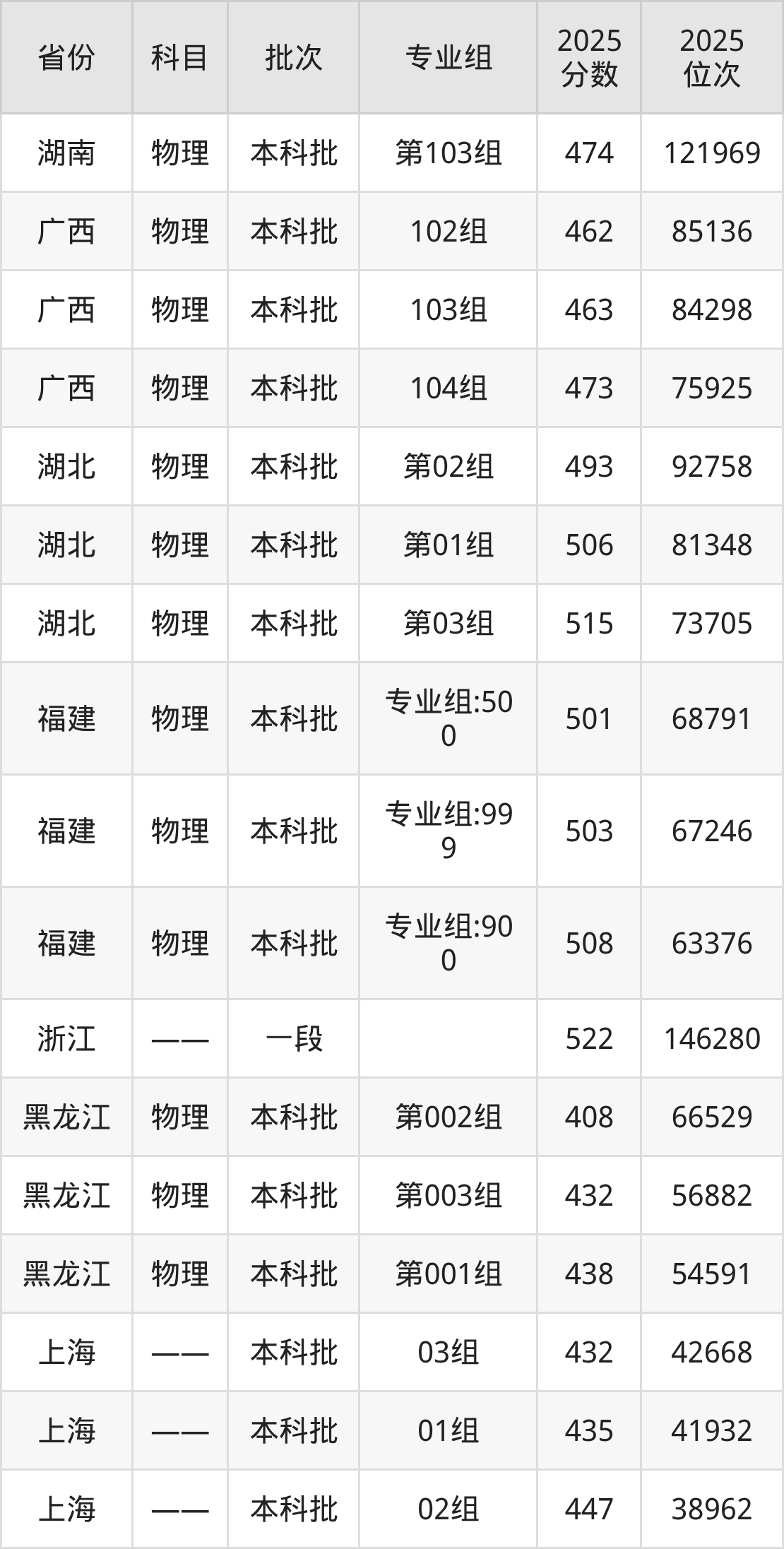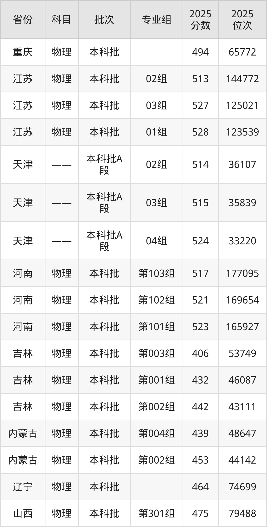 2025年在本科物理类进行招生,各专业组分数线详情如下: