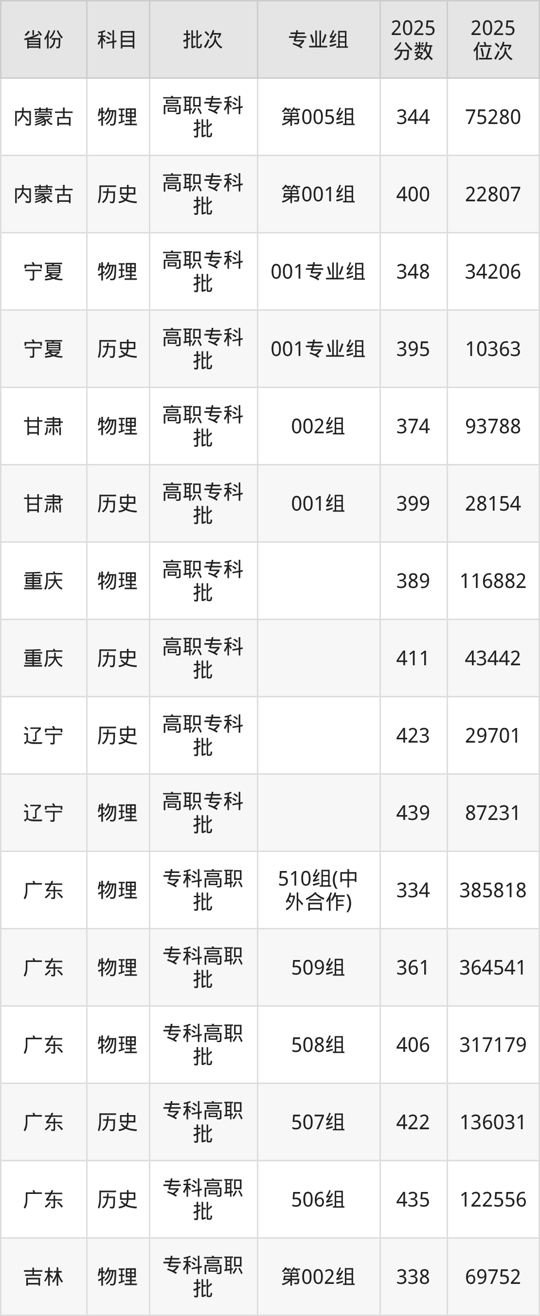 2025年重庆工商职业学院全国录取分数线是334分到473分,录取最低在广东物理类(510组(中外合作))、录取最高在河北历史类。各省各专业组最低分具有差异,详情如下: