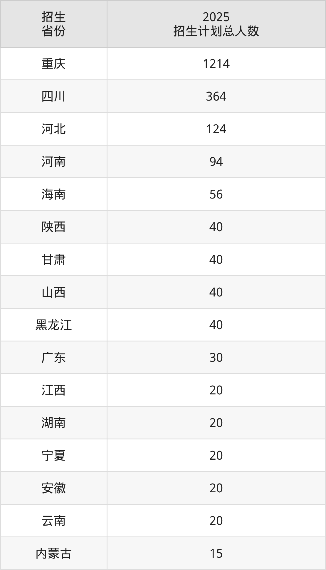 2025年重庆工商职业学院面向全国22个省市开展专科招生;招生专业共41个,招生人数共2217人。2025年在重庆市招生计划总人数是1214人,其中,重庆工商职业学院在重庆市招生人数最多的是汽车制造类。重庆工商职业学院在各省具体招生人数情况如下表。