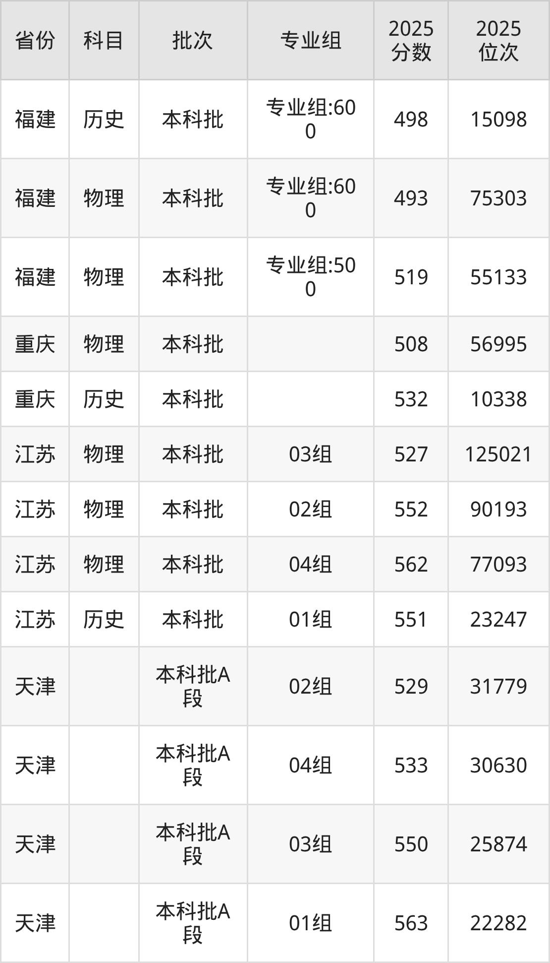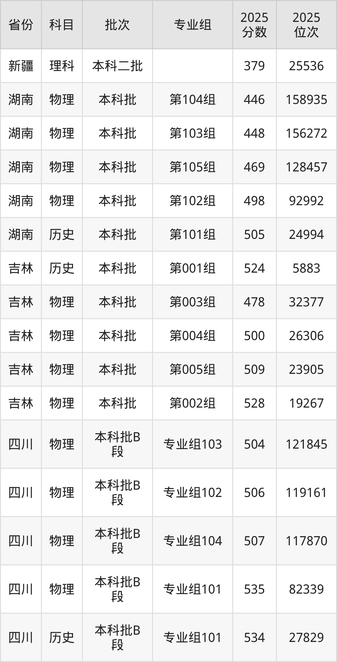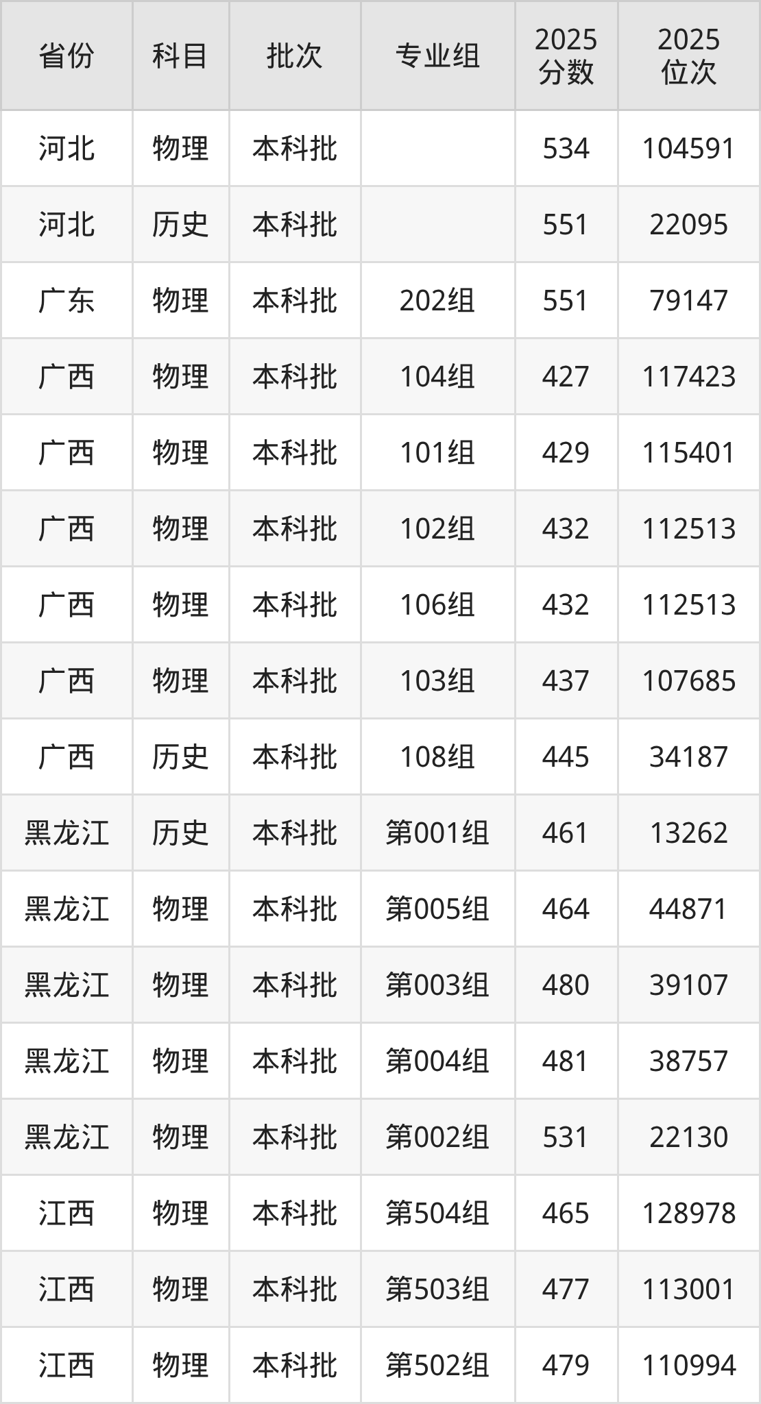2025年在本科物理类进行招生,各专业组分数线详情如下: