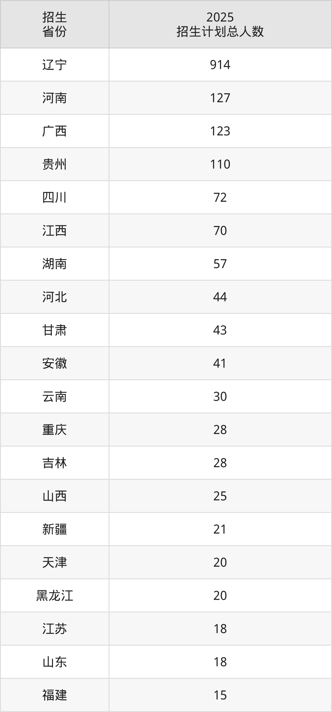 2025年沈阳医学院面向全国25个省市开展本科招生;招生专业共22个,招生人数共1876人。2025年在辽宁省招生计划总人数是914人,其中,沈阳医学院在辽宁省招生人数最多的是临床医学。沈阳医学院在各省具体招生人数情况如下表。